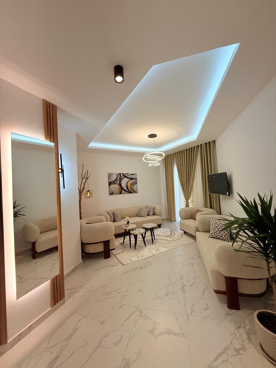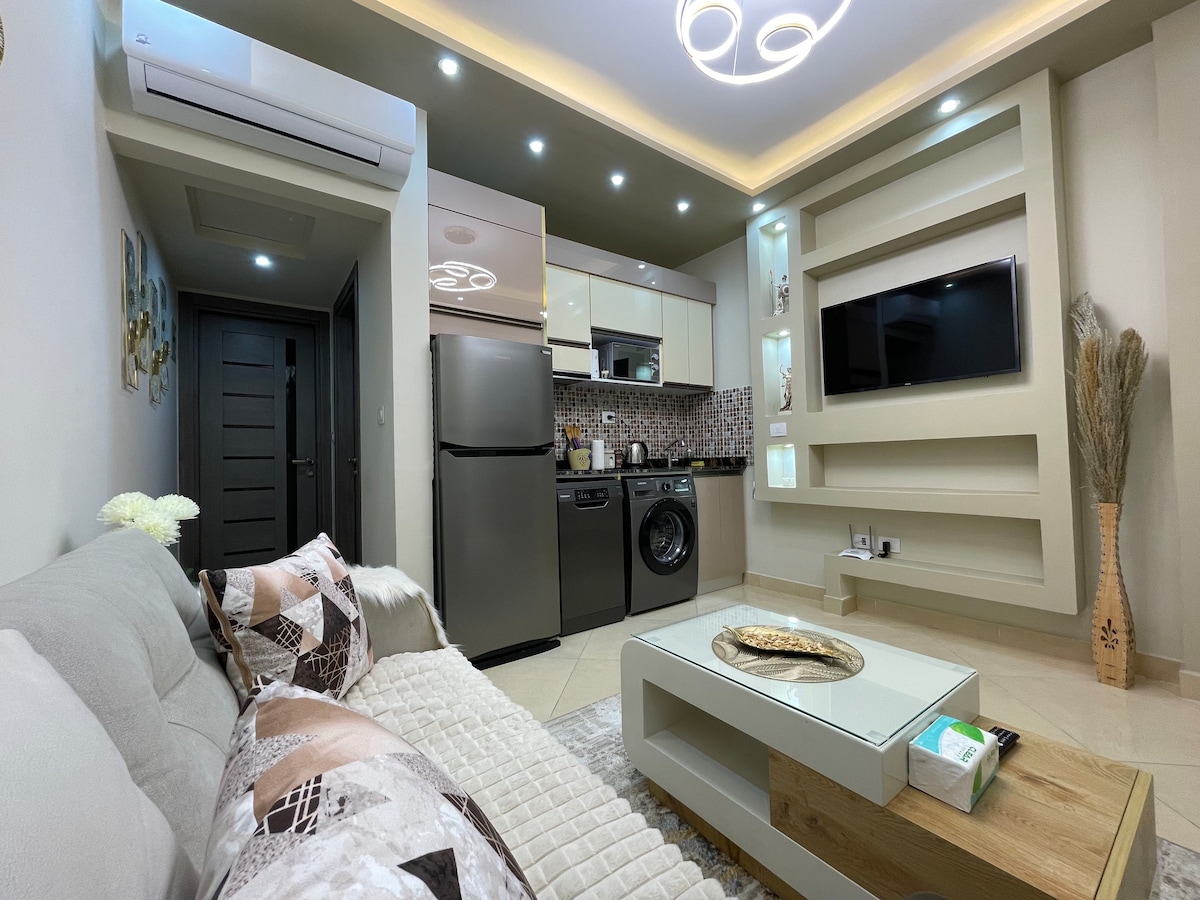 Kick back and relax in this calm, stylish space. Brand-new luxury apartment in peaceful Montazah with premium renovation and modern design. Ground floor with direct terrace to shared pool-step out for a swim!Great pool views. Rooftop pool with panoramic Red Sea views 5-min walk to beach 5-min drive to SOHO Square (restaurants,bars,shopping,shows 70 m²:1 bedroom(sleeps 2),open living+full kitchen (new appliances+washer Fast Wi-Fi,Smart TV, AC,free parking,secure complex. + Sharm Guide❤️