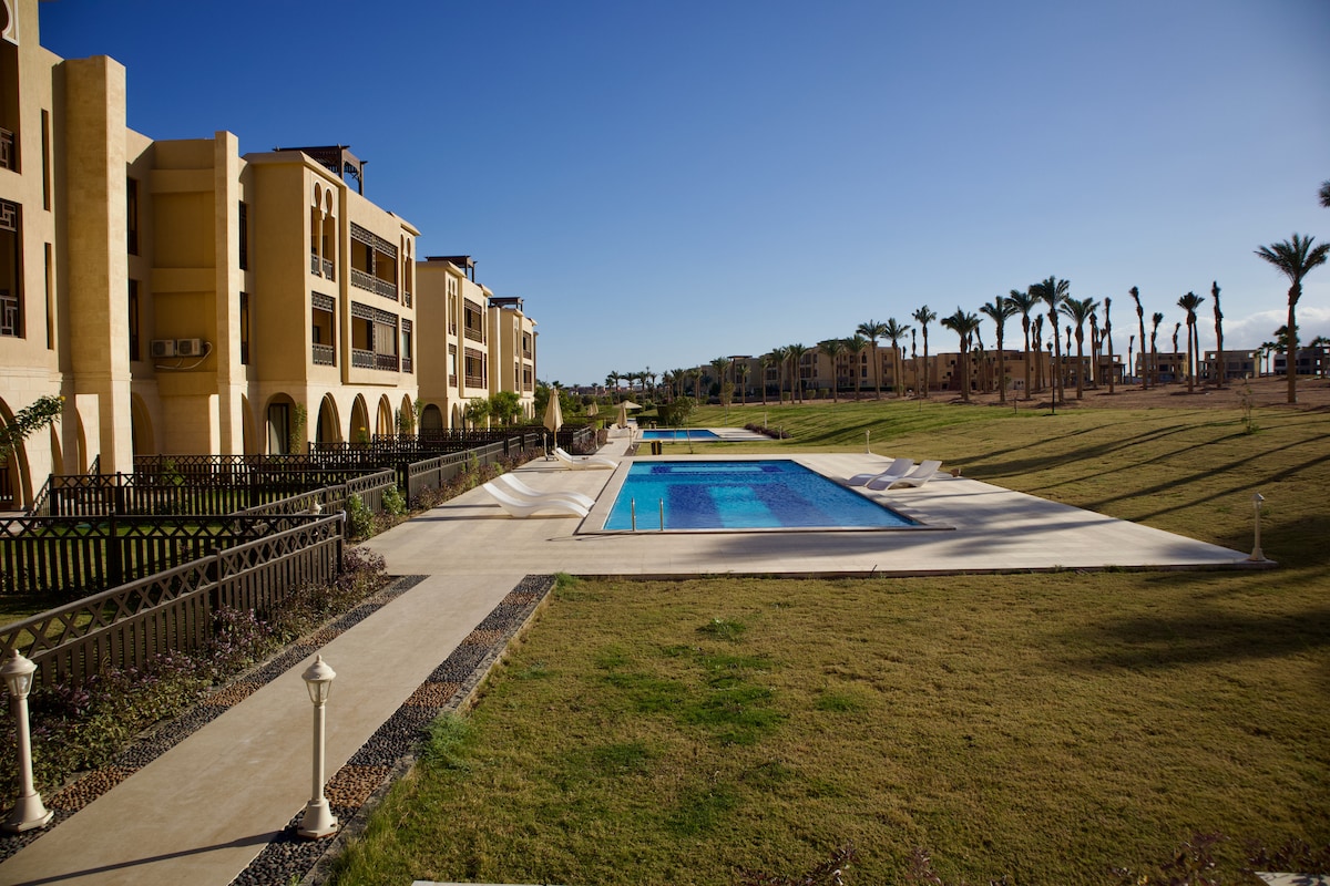 Amazing 2 bedrooms, ground floor, with amazing pool view panoramic from the top of Naama Bay, large living room with American kitchen, corner sofa, bedroom with viewing the panoramic Bay of Naama Bay, another bedroom Very comfortable for 2 adults, has a corner sofa for total relaxation with the green and the blue colour of the pool Everything's you need for food and Drinks, and can be delivered to your home, Blue Stone restaurant give a 20% discount for food and beverages. disco-tech