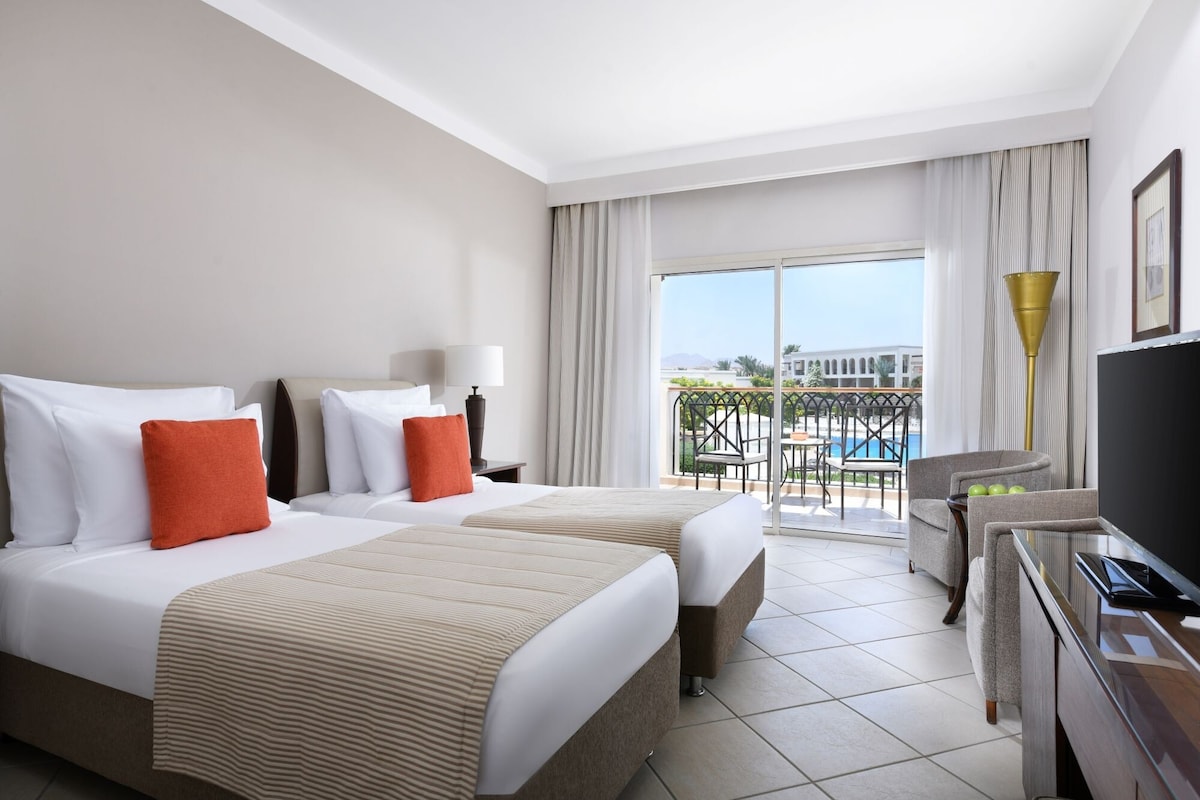 En plein cœur du superbe resort 5* Domina Coral Bay vous logerez dans une chambre tout confort rénovée et décorée avec soin toute équipée disposant d’un grand lit en 2.20 m à séparer et d’un canapé lit pour 1 personne avec Téléviseur, réfrigérateur, micro-ondes, cafetière Nespresso, bouilloire, d’une salle d’eau avec douche, machine à laver, sèche cheveux et d’une magnifique terrasse vue mer à 5 minutes du lac salé, de la plage et 1 min de la réception, vous disposerez de toute l’infrastructure