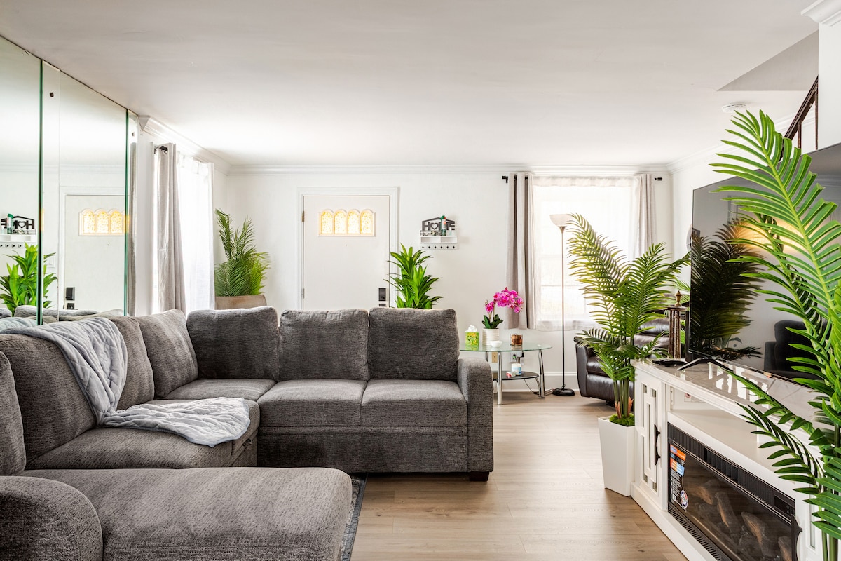 Beautiful, cozy, sunny room with a super comfy L-shaped sectional sofa. Super clean and spacious fully equipped Eat-in kitchen with dishwasher, stove, oven, microwave, regular and K-Cup coffee makers, Micro-wave, Toaster, Pots, Pans, Utensils, and Silverware all provided. The apartment includes (2) 43" Flat Screen TVs; streaming HULU-Live, Amazon Prime, Disney Plus. Also, a little work desk area provided Free washer/dryer access and Free parking, (short-term lease available).