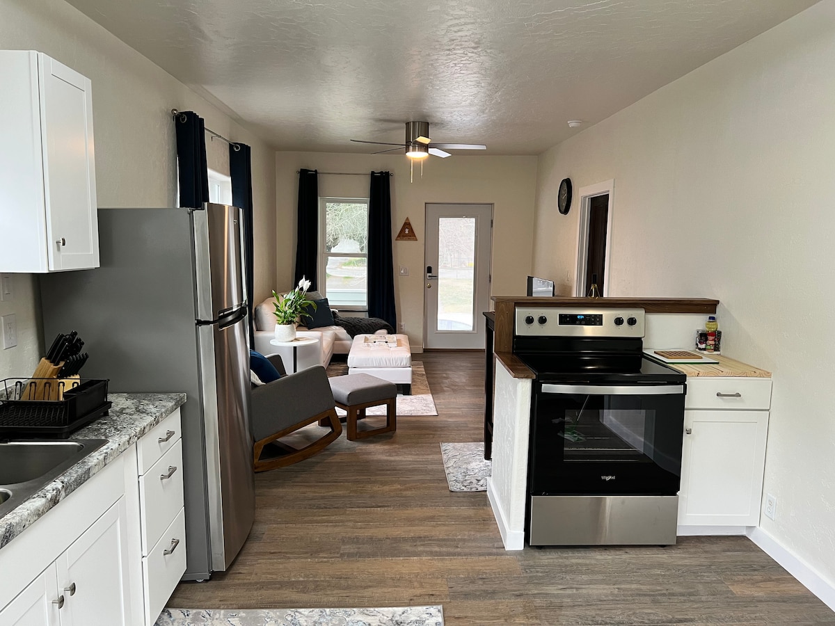 The Blue Haven, located in the friendly Gateway Community is the perfect place to rejuvenate and unwind. Kick back and relax in this calm, stylish space with all new amenities. The kitchen is fully equipped and prepped to make any meal. The firm queen bed and firm pull-out sofa are extremely comfortable with cooling mattress toppers and pillowcase covers. It is a 4-minute drive from downtown, a quarter mile from the headwaters, and .2 miles walk to the Peace Garden.