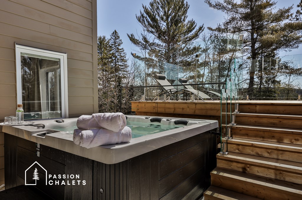 CITQ #302690 Magnifique chalet toit cathédrale, bord de l’eau (paddle board, kayaks, pédalo), piscine hors terre, spa, foyer extérieur (bois inclus), 3 chambres lits queen + 1 lit double (salle familiale), cuisine toute équipée (Nespresso, cafetière automatique à filtre, air fryer, raclette, fondue, machine à gaufres, grille-panini, blender, etc.), BBQ, ping pong, air climatisée, wifi illimité, plancher chauffant au RDC. Sentiers de randonnée à pied du chalets et multiples activités à proximité.