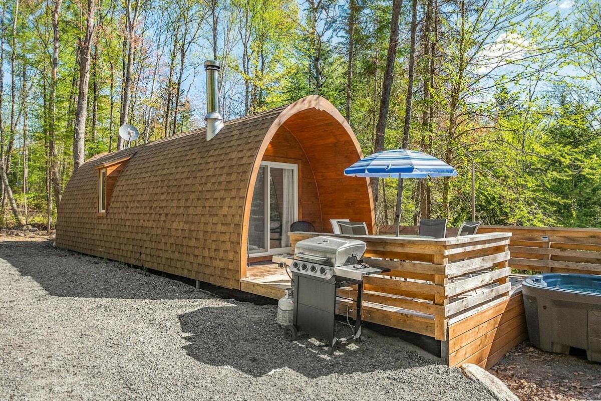 AVENTURE - HIKING Expérience de glamping unique en pleine nature! Situé à 20 min de marche en forêt du bâtiment d'accueil. Équipé de: 1 lit Queen BBQ, articles pour cuisiner 18 litres d’eau potable(pas d'eau courante) Poêle à bois et bûches(Pas de chauffage électrique) Éclairage solaire Toilette sèche à l’extérieur du chalet Accès à une salle de bain avec toilette et douche à l’intérieur du bâtiment principal . Profitez de la zone spa : 1 sauna et bains nordiques, le tout à 20 min de marche.