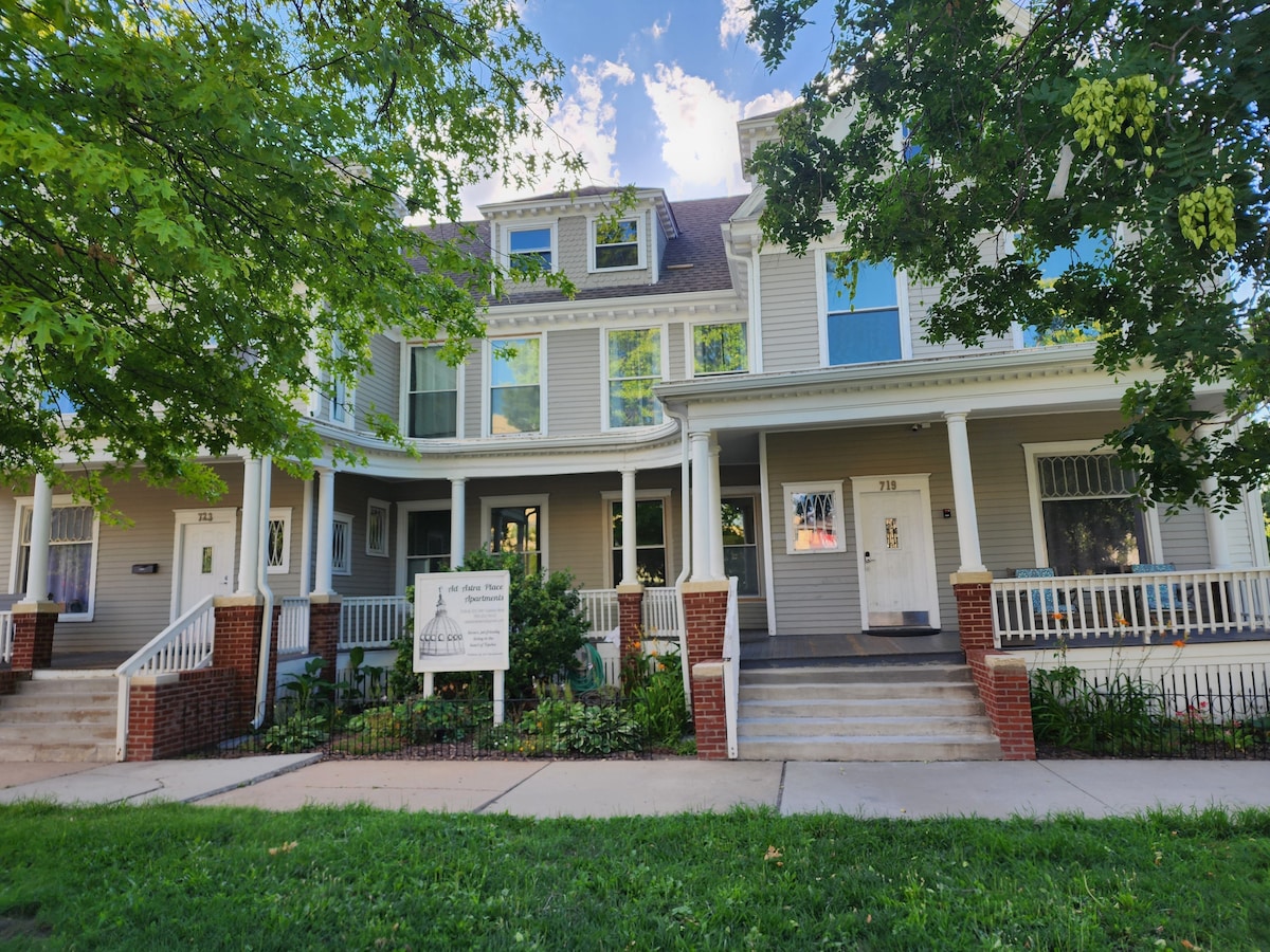 Located 2 blocks from the State Capitol Building and a 5 minute walk to Kansas Avenue, the main downtown street with many shopping and dining options, this apartment is roomy and comfortable. With one queen bed and a queen airbed available upon request, up to 4 people can sleep comfortably in this unit. The unit has been fully renovated and is part of an 18 unit building which was built in 1904. Modern features and amenities have been added to the apartment, the building, and the grounds.