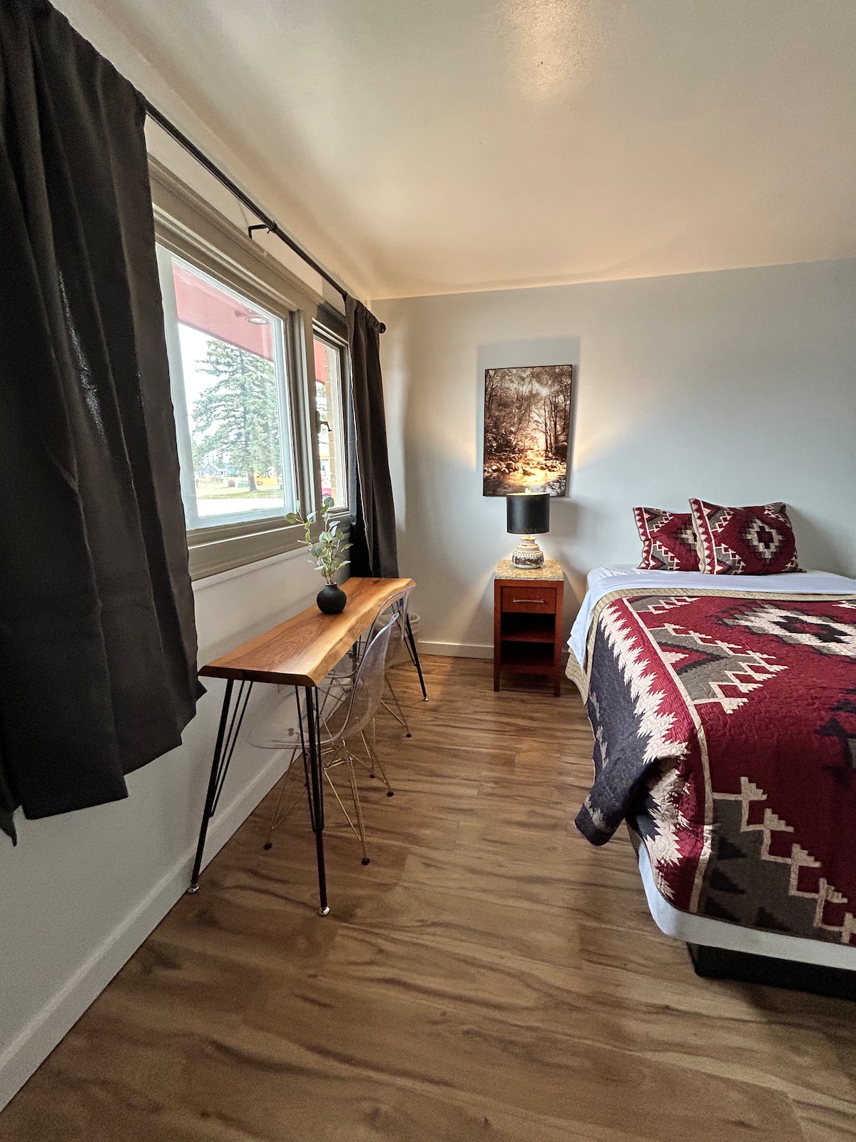 Sweet & Simple Boutique Hotel room with shady lake views, just steps from historic Elkhart Lake. Your stay includes beach access and a relaxing, semi-private deck overlooking the lake. The space features two adjoining rooms for added privacy, with one large bathroom (shower/tub), classic Kohler fixtures, and plenty of towels and toiletries. NEW Sealy mattresses. Room also includes a small fridge, Keurig coffee maker, and a selection of breakfast bars. 1 Parking spot in private lot included