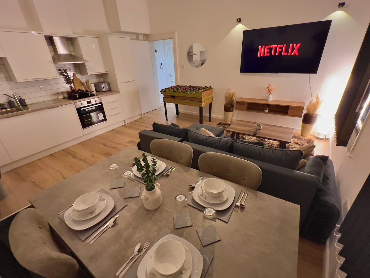 Large stylish open plan loft apartment, located right in the middle of Sheffield City Centre. ✔ 2 x Car Parking spaces right outside ✔ Amazing location - walking distance all the bars, theatres, restaurants etc ✔ Roof Terrace with Hot Tub ✔ Open-plan living ✔ Fully equipped kitchen ✔ Spacious bedrooms ✔ Wi-Fi & Cinema TV/Sound Bar ✔ Nearby both Universities & Hospitals