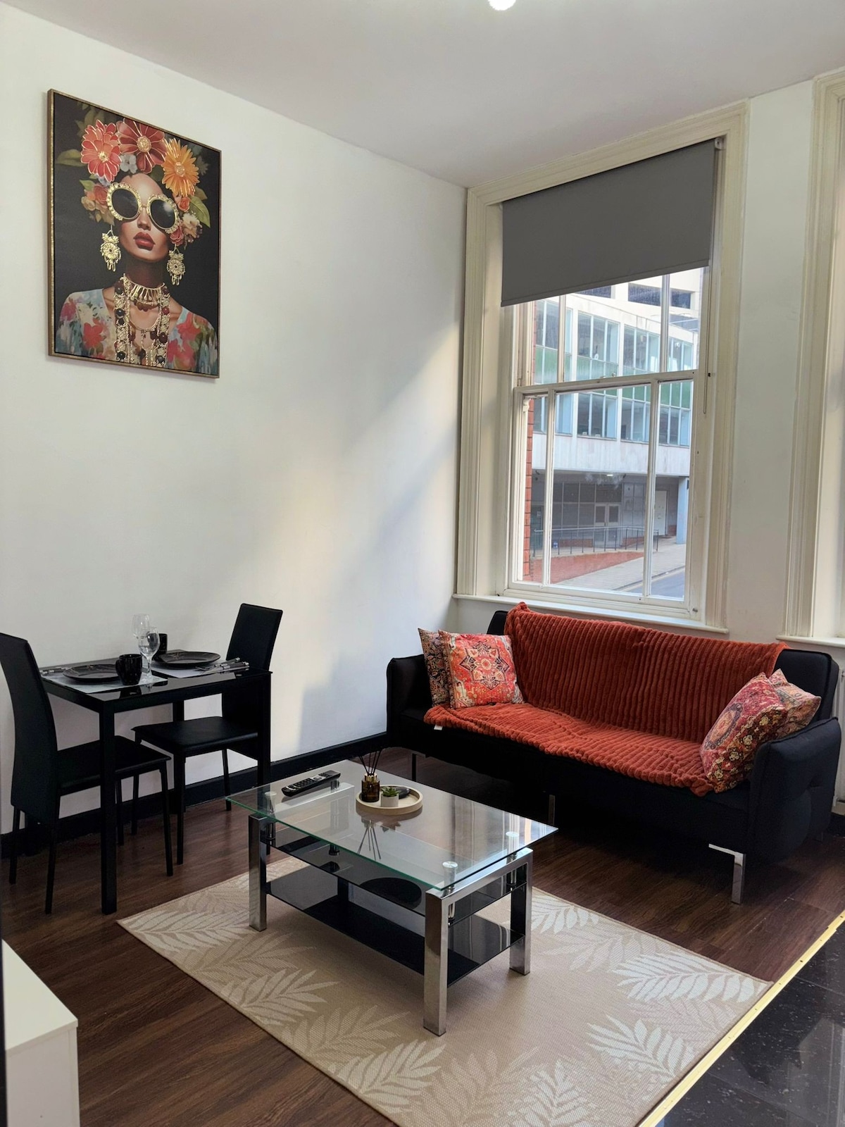 One of two unique apartments in the heart of Sheffield City Centre, housed in a Listed Building dating back to 1792, most recently used as an arts centre. The apartment is brand new, beautifully renovated and provides a tranquil resting place only a stone's throw from shops, restaurants and theatres. The Crucible is a 5 min walk and tram, bus and train stations are all a short walk away, NCP Car Park is opposite. Fully equipped with everything you need and we are happy to deal with requests.
