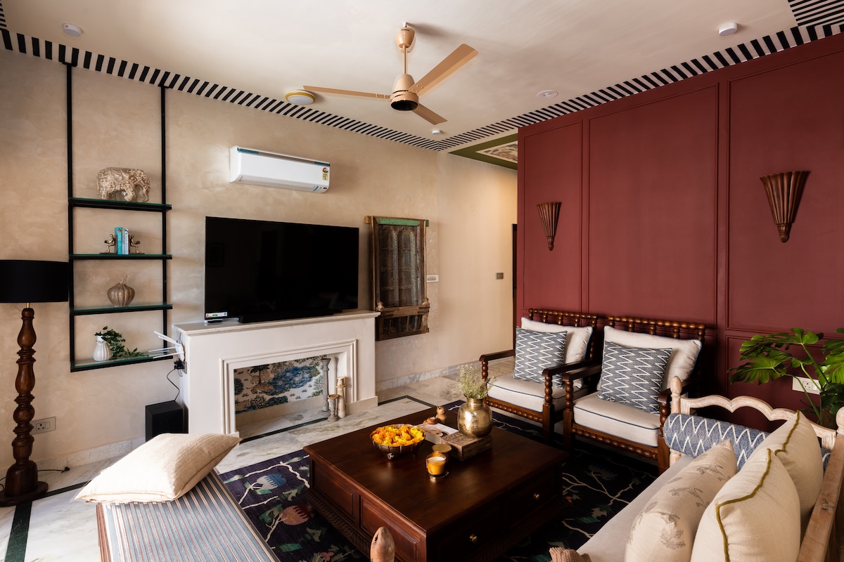 Located in the heart of Jaipur in the charming residential area of Bani Park, the apartment offers a blend of comfort and style. Enjoy luxe amenities like a smart TV, a fully equipped kitchen, fresh bedding, high-speed internet, and in-house laundry with ironing facilities. The muted tones, soft hues, and handprinted floral motifs inspired by the Pink City create a warm, vacation-ready vibe—making it a perfect home away from home during your Jaipur visit.