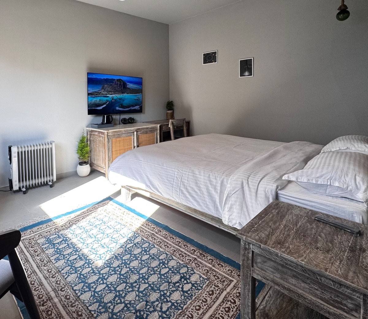 Discover comfort and charm in our cozy room, adorned with antique furniture! Bathed in soft light, the room is equipped with a king-size bed, a ceiling fan, a kettle, a cute plant, a wardrobe with hangers, a mirror, a coffee table, a bin, rugs, a coat rack, and wall storage. Towels, bed sheets and blanket are provided. Strong wifi available! The private ensuite bathroom is equipped with a hot shower, sink, and toilet.