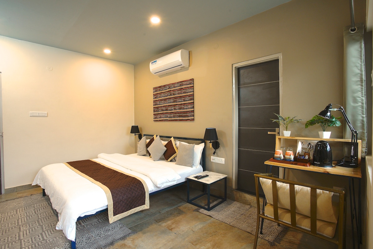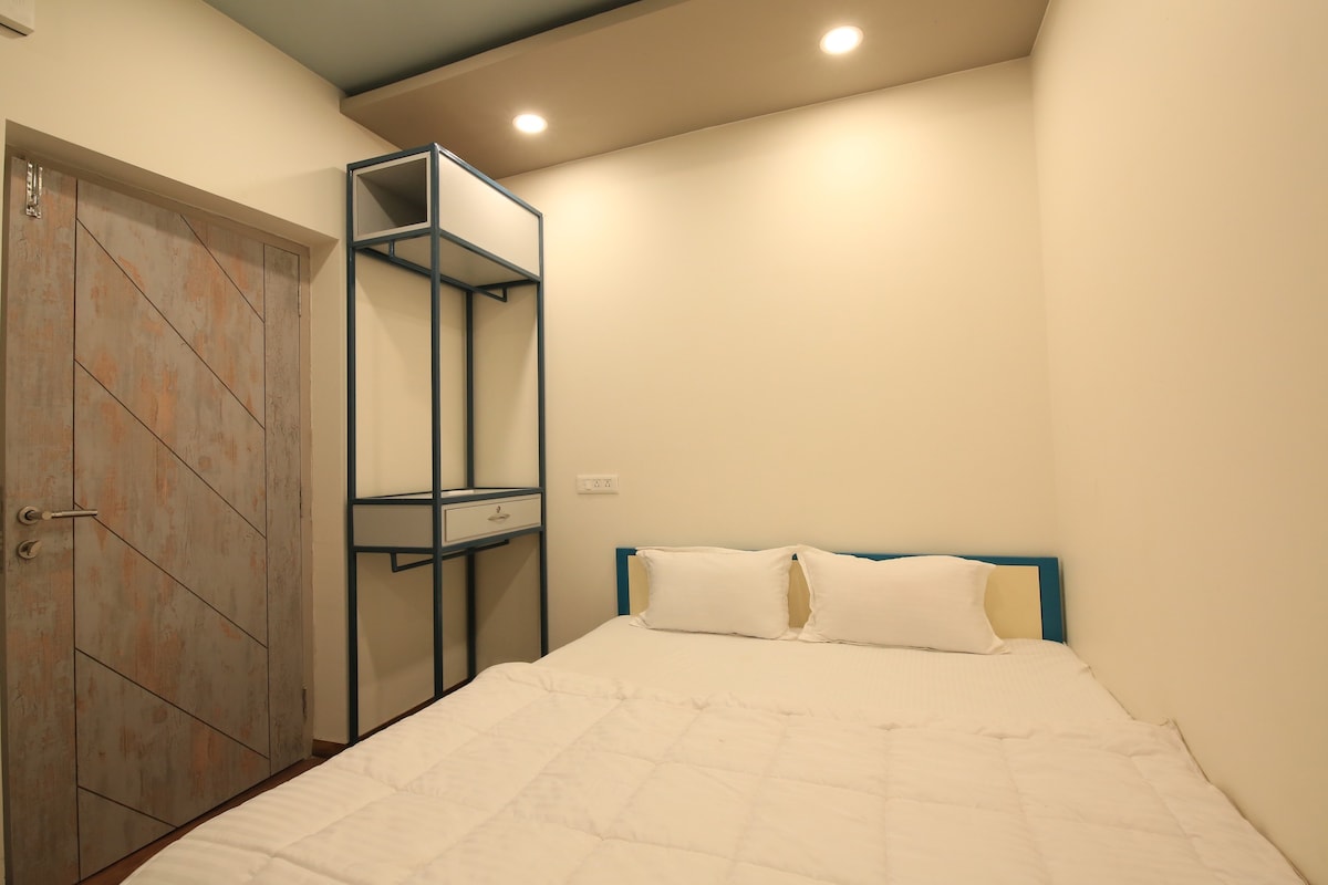 Large California King Sized bed with a hybrid H.R. Super soft foam mattress for extra comfort during your stay. There is a minimalist wardrobe designed for travelers with 2 Hanger spaces and lockable drawers as well as an open space to keep your bag/suitcase at a convenient height. Above it all it's great for families or a group of 3 friends as it has an option of adding an Extra Bed