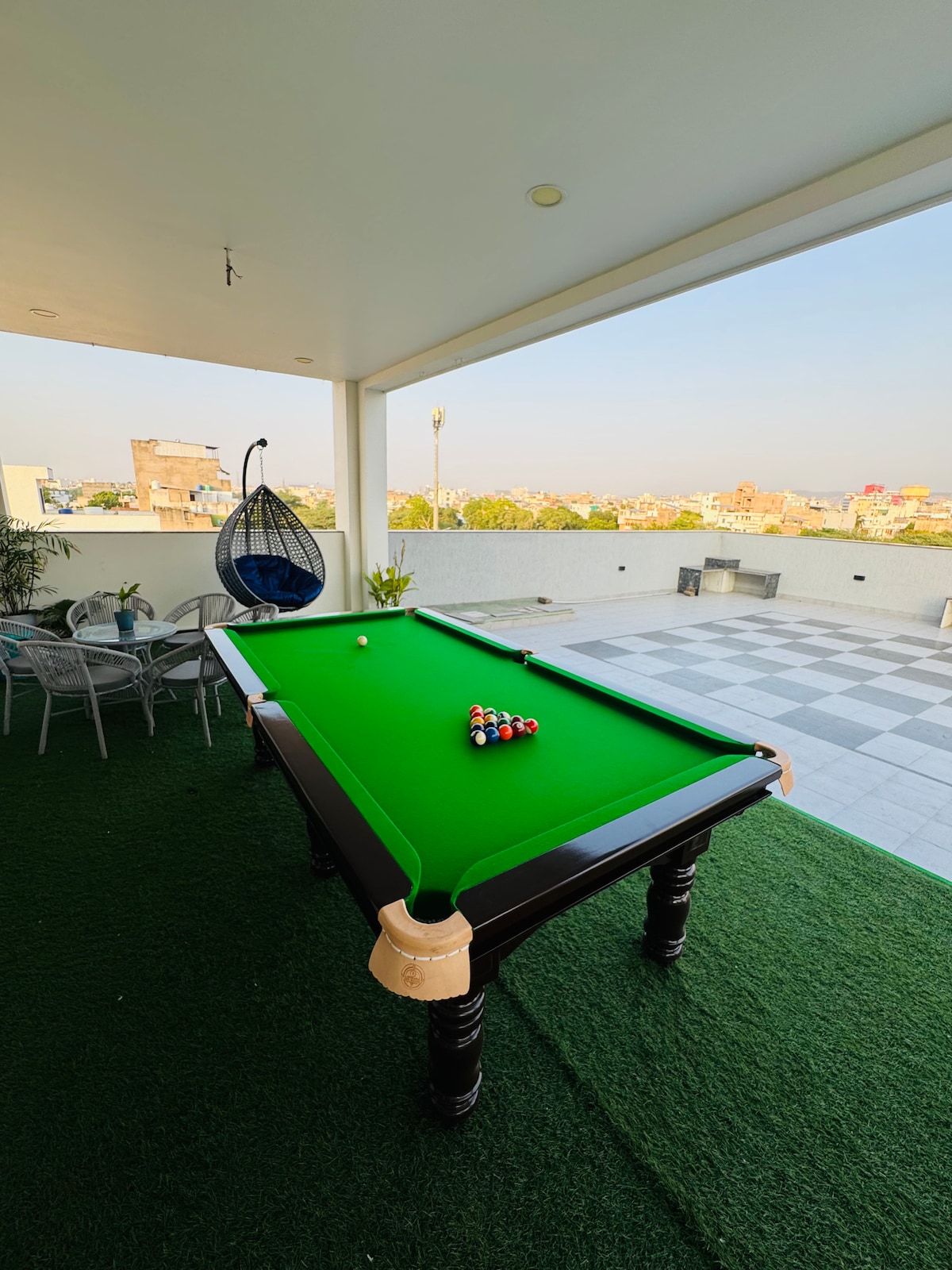 Dolce Den – A Luxe Artistic Stay in Jaipur Expansive Patio: Perfect for morning coffee or starlit soirées. Entertainment Suite: State-of-the-art projector and sleek pool table for ultimate fun. Opulent Bedrooms: •Lunar Retreat: Drift under moonlit art and serene murals. •Flamingo Suite: A vibrant flamingo-inspired luxury Gourmet Open Kitchen & Bar: A chic space for culinary creations and stylish sipping Dolce Den blends serenity and opulence for an unforgettable experience.