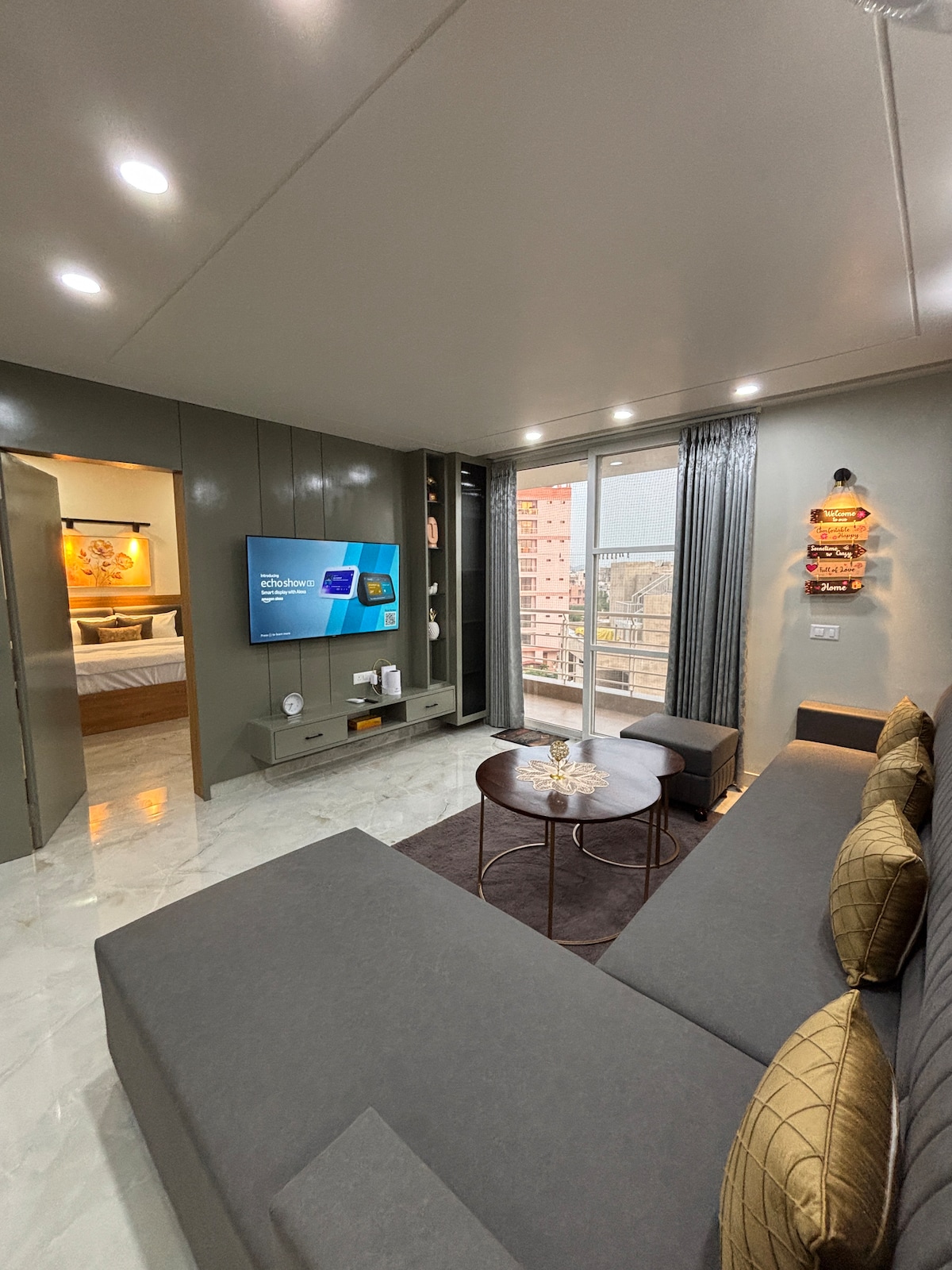An artistic space thoughtfully curated .Tucked away from the hubbub of the city.This luxury two bedroom apartment comes furnished with a spacious living room designed to Netflix & Chill.Get lost within yourself as the aesthetically lit corners of the apartment embrace you in a warm hug. Enabled with all major amenities and comfort , We have kept everything in mind from chic high end bedroom, To the best Netflix n chill setting.This apartment doesn't fail to impress its guests.