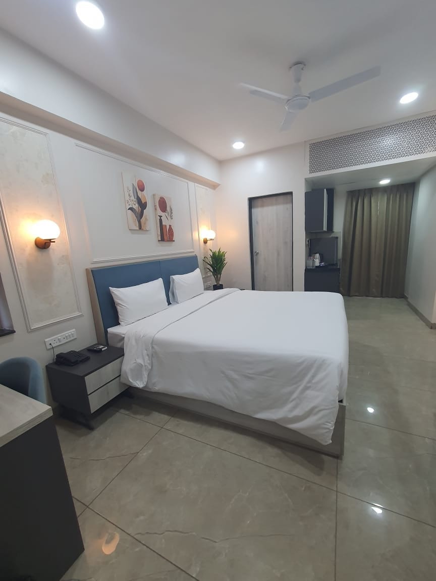 Welcome to this most luxurious and spacious studio apartment (completely separated) with balcony, comfortable king sized bed, beautiful bathroom and fully equipped kitchen, free wifi, free parking Swimming pool (open from April to September or October depending on weather) gym, rooftop garden. located in central of Jaipur, railway station is just - 4 mins away, bus stand - 4-5 mins away AirPort - 9 km Hawa mahal - 4 km City palace - 4.1