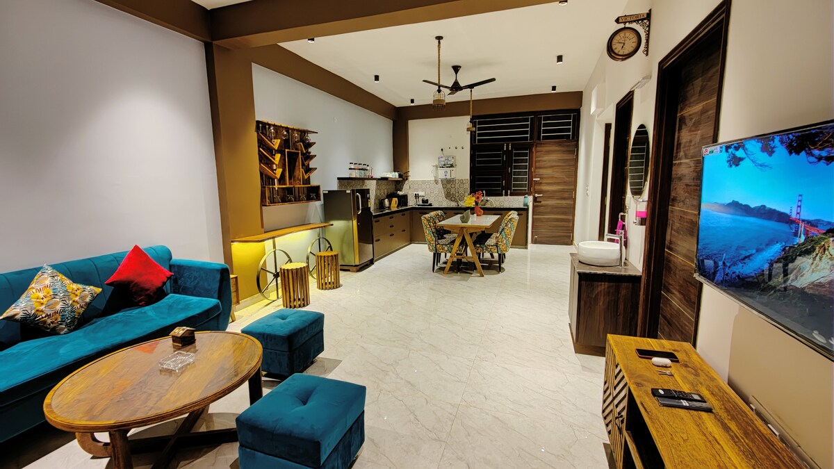 BLUO STAYS - Award-winning Sanitized Homes! Private 1BHK Flat with Elevator & Terrace Garden seating - Bedroom with Bathroom, separate Living room with Couch, Dining Table & Fully loaded Kitchen with Stovetop Gas, Refrigerator, Microwave, cookware, etc. All-inclusive Daily Rentals - Washing Machine, Cleaning, WiFi Internet, Netflix/TataSky, Utilities, Parking, Lift, Power backup. Perfect Vacation Rental, a short drive from Jaipur Tourist Places...
