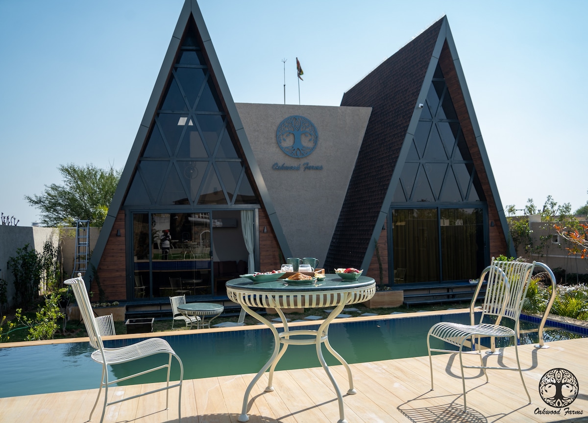 Oakwood Cottages are having 2 pair of blocks. Each Cottage has designed with 2 Guest Bed room, Lounge, swimming pool, Kitchen and garden to offer you a comfortable and memorable stay with family and friends. You may book both the cottages where 4 Bed Rooms available or you may book one cottage with 2 Bed Room. Incase of One cottage Booking sharing would be best option available. This is part of Oakwood Farm Jaipur where we have a 3 Bed Room Villa also available for Group stay.