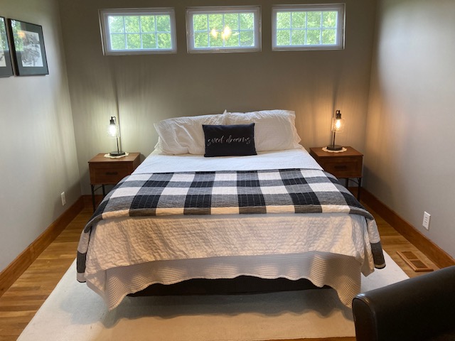 This memorable place is anything but ordinary. We’re a mile from I74 exit. This is a 2000 square foot house with a great room that towers to 14’ ceilings. Two large bedrooms with large walk in closets for extra dressing space. Out of the kitchen window you’ll view a forest of 100 trees. (And we’re in town!) Fully furnished kitchen to prepare your meals. You’ll find a beautiful park across the road with miles of wooded walking trails and a lot to explore. Lots of parking. Easy access.