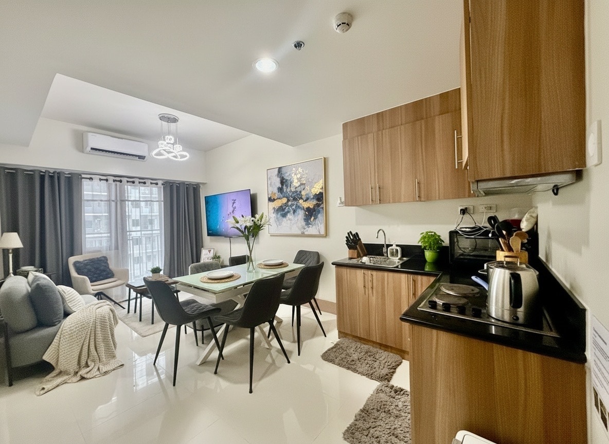 A fully-furnished, Ig-worthy, cozy and stylish 34sqm, 2-BR condo corner unit with an awesome balcony where you can relax, celebrate important events or just have a quick get-away with your family or friends and enjoy unique, world-class amenities like the wave pool, man-made white beach, children's playground, basketball court, gym, volleyball court, beach bar, sky garden and many more. It is just a 5-minute walk from a shopping mall (SM Bicutan) and only 10-15 minutes away from NAIA Airport.