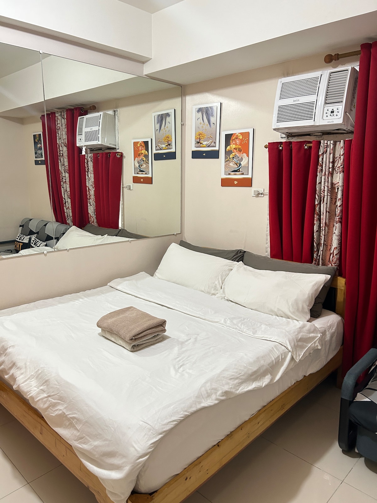 Studio unit can accommodate 4adults 1kid. 📍Acqua Residence Mandaluyong Check in&out 2:00pm/12:00pm - 1 queen size bed - 1 double size extra floor mattress - FREE use of swimming pool - FREE coffee & toiletries - FREE use of condiments - Wifi/ Smart TV with Netflix - Board games - Dining utensils - Induction cooker - Electric kettle - Microwave - Refrigerator - Rice cooker - Drinking water provided - PAY PARKING (400php + whole stay) first come first serve only