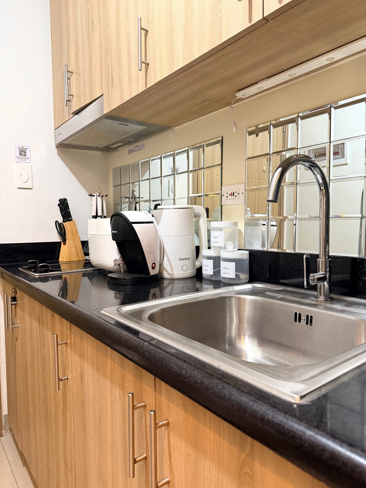 Welcome to our minimalist-designed 1 bedroom unit with an amazing pool view. Relax in the airy living area with our smart TV, cook your meals in our fully-equipped kitchen to dine-in or simply enjoy moments looking out the balcony. But most importantly, sleep soundly in our comfortable beds. Located at walking distance to Ikea, SMX Convention Center, MOA Arena and those surrounding the Mall of Asia area. Indulge in the nearby restaurants, cafes and convenient stores just outside the condo.