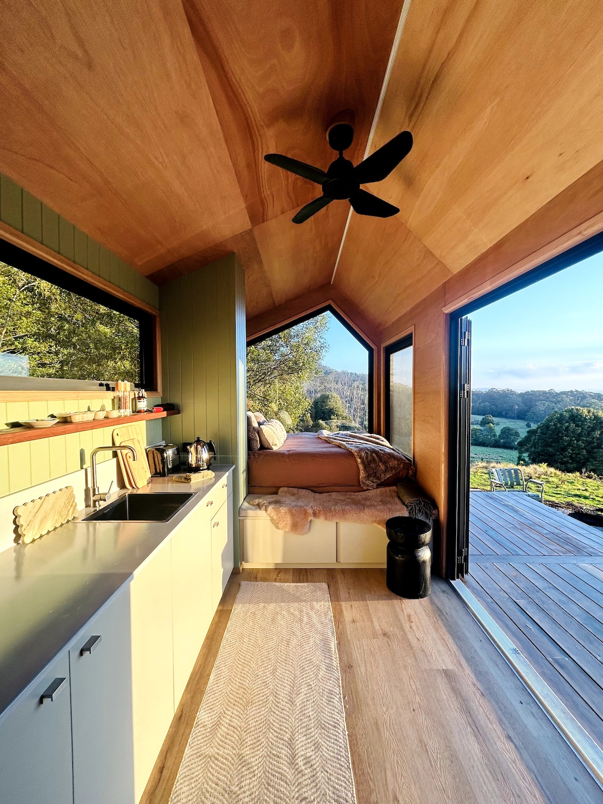 "SkyDreamer" is an off grid Tiny Home designed for couples with an outdoor wood fired hot tub to relax. Nestled in nature with panoramic skyline views, situated between Robertson and Jamberoo. Perched up high on a working regenerative farm where you will watch the chickens and cows roam. Hot tub to soak in, fire pit, indoor fire for the cooler months, outdoor cooking and includes locally sourced breakfast fresh eggs from our farm, bread, bacon, butter, honey, olive oil, very good coffee & tea.