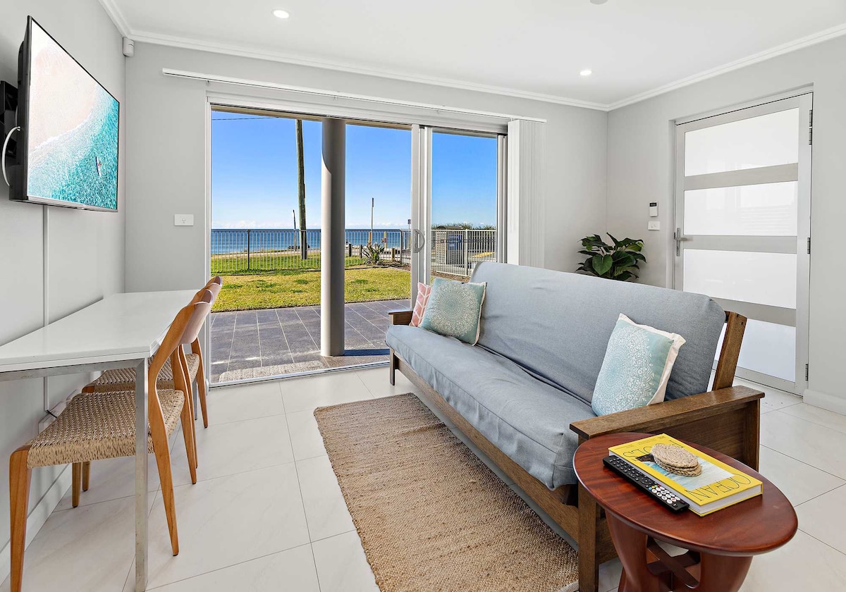 Escape to this stylish beachfront 1 bedroom beach shack (with direct beach access to beautiful Jones Beach). Private 1 bedroom house recently renovated, bright & airy, with great beach views from full kitchen, dining room, lounge room & small 2 person balcony & with its own pathway & entrance, completely separate from the studio residence below. Loungeroom (with large Smart TV, large lounge, plants, beach art, etc). Bedroom has a comfy queen bed & bathroom has a big all-in-one bath / shower.