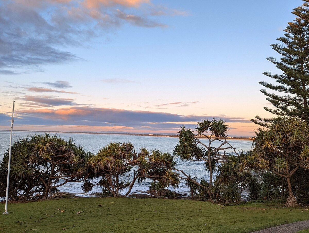 BEST VIEWS IN KINGS BEACH!!! Enjoy a sundowner on your Huge Private Rooftop whilst taking in 360 DEGREE VIEWS!! of The Glasshouse Mountains, Bribie, Moreton Is, Shelly Beach & more in this cute, air conditioned renovated "Beachhouse" style 2 BR unit that sits atop the Caloundra Headland, just 2 mins walk from Kings Beach. With tons of cafes/shops nearby, a 100 metre stroll to the pub & all mod cons (& ocean views from the bedroom, kitchen, dining & lounge rooms) you'll wish you'd stayed longer!