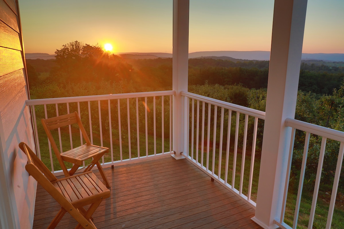 Welcome to our Orchard Oasis, steps away from the Granny Smith & Gala Apple Trees at Showalter's Orchard, home of Old Hill Cidery. We built this light-filled, romantic aerie to highlight extraordinary views of The Massanutten and the Blue Ridge Mountains, The Shenandoah Valley, rows and rows of apple trees, and abundant wildlife, all from your front porch. The two-story cottage could be a base for all your Shenandoah Valley Travels or a comfortable and cozy place for your farm vacation.
