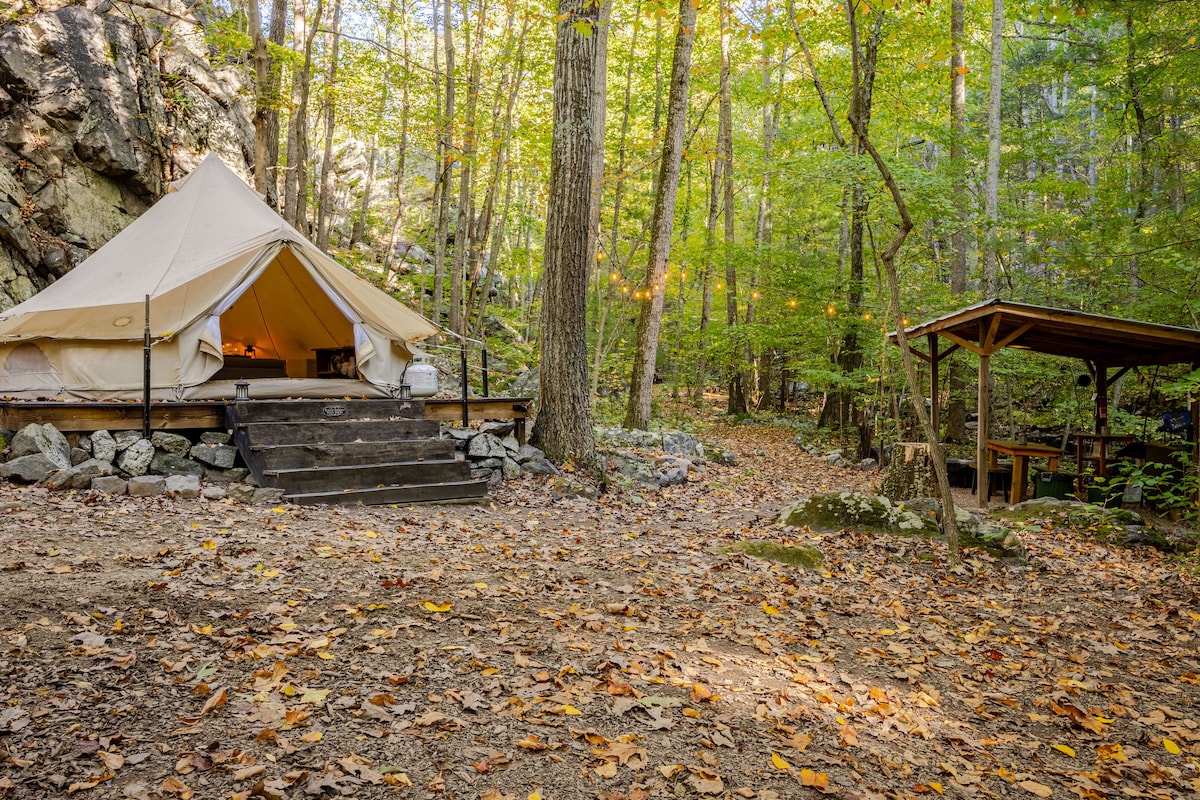 The spacious one bedroom yurt is located high on a forested hillside in the middle of 15+ acres. Come enjoy a natural and serene getaway with all the comforts of home- a full kitchen (ie, all utensils, setting for four), a bathroom with shower and laundry, a queen bedroom, and a queen foldout sofa in the living room by the wood burning stove. The windows roll up from the outside and have permanent screens inside. There is also a BBQ grill, a separate firepit, and WiFi via satellite.