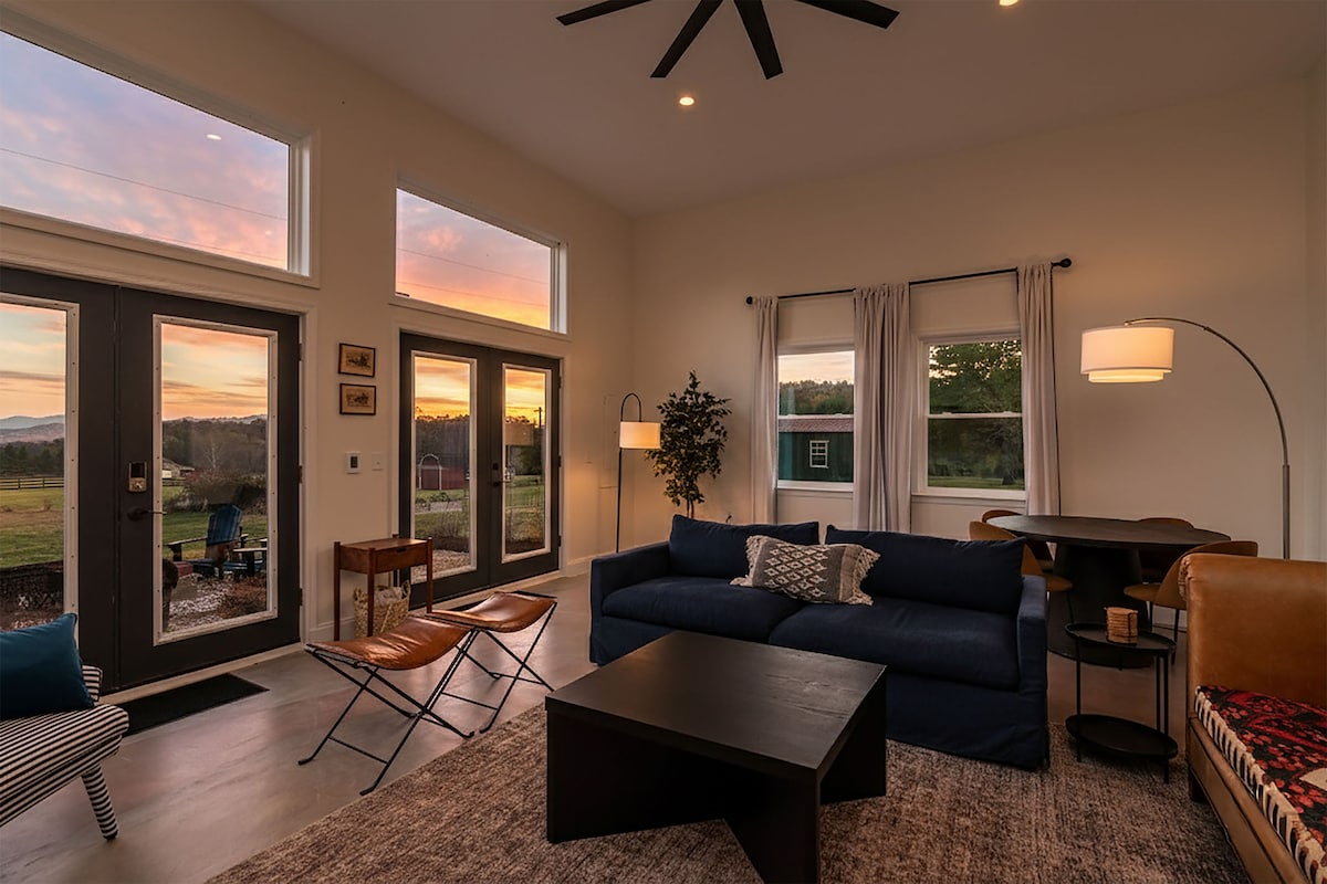 The Hay Loft sits in the middle of 43 beautiful acres, overlooking our working hay farm with stunning views of the Shenandoah Mountains. We are conveniently located near restaurants, vineyards, antiquing, battlefields, golf resorts, ski resorts and caverns. Spacious rustic/luxe suite w/gas fireplace; king bed and bathroom with tiled shower, Keurig coffee maker, microwave, toaster oven, small refrigerator, no freezer, dishes and and outdoor gas grill and indoor gas fireplace. Outdoor firepit.