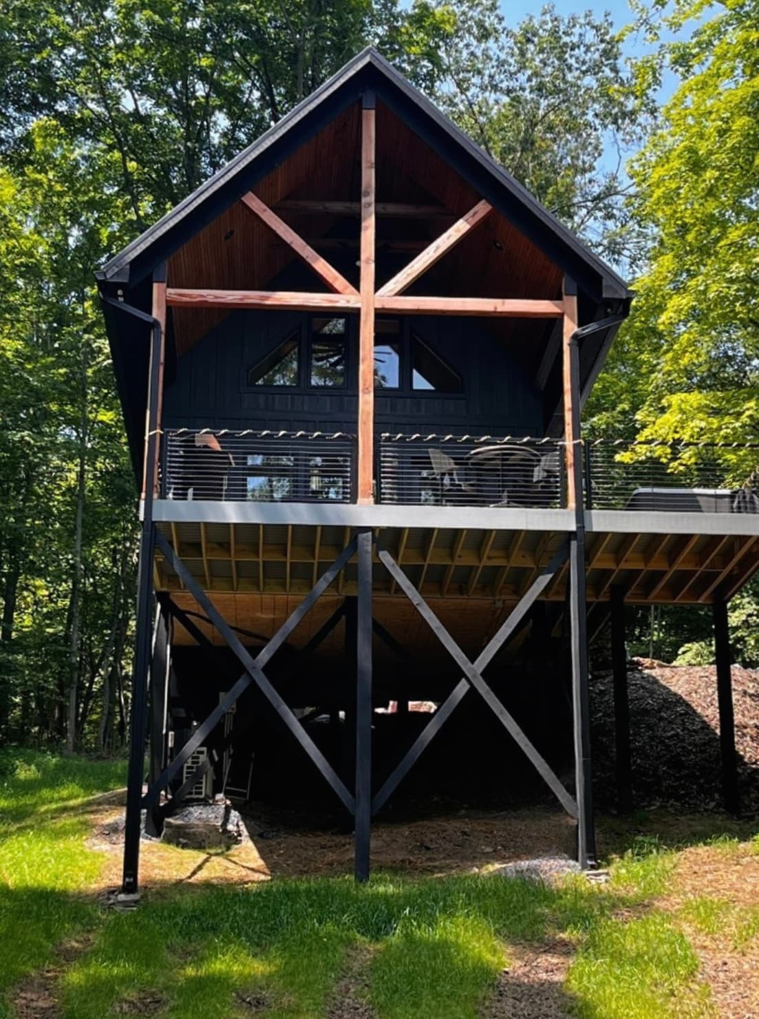 Tucked away in the woods, this Scandinavian-inspired treehouse is a quiet, peaceful spot designed for a relaxed couples getaway. Surrounded by trees and overlooking beautiful woodland views, it’s an easy place to slow down and unwind. Spend your time on the wraparound porch, soak in the hot tub, cool off in the creek, or settle in by the fire at night. This is a serene, comfortable retreat where you can reset, enjoy all that nature has to offer, and simply be present.