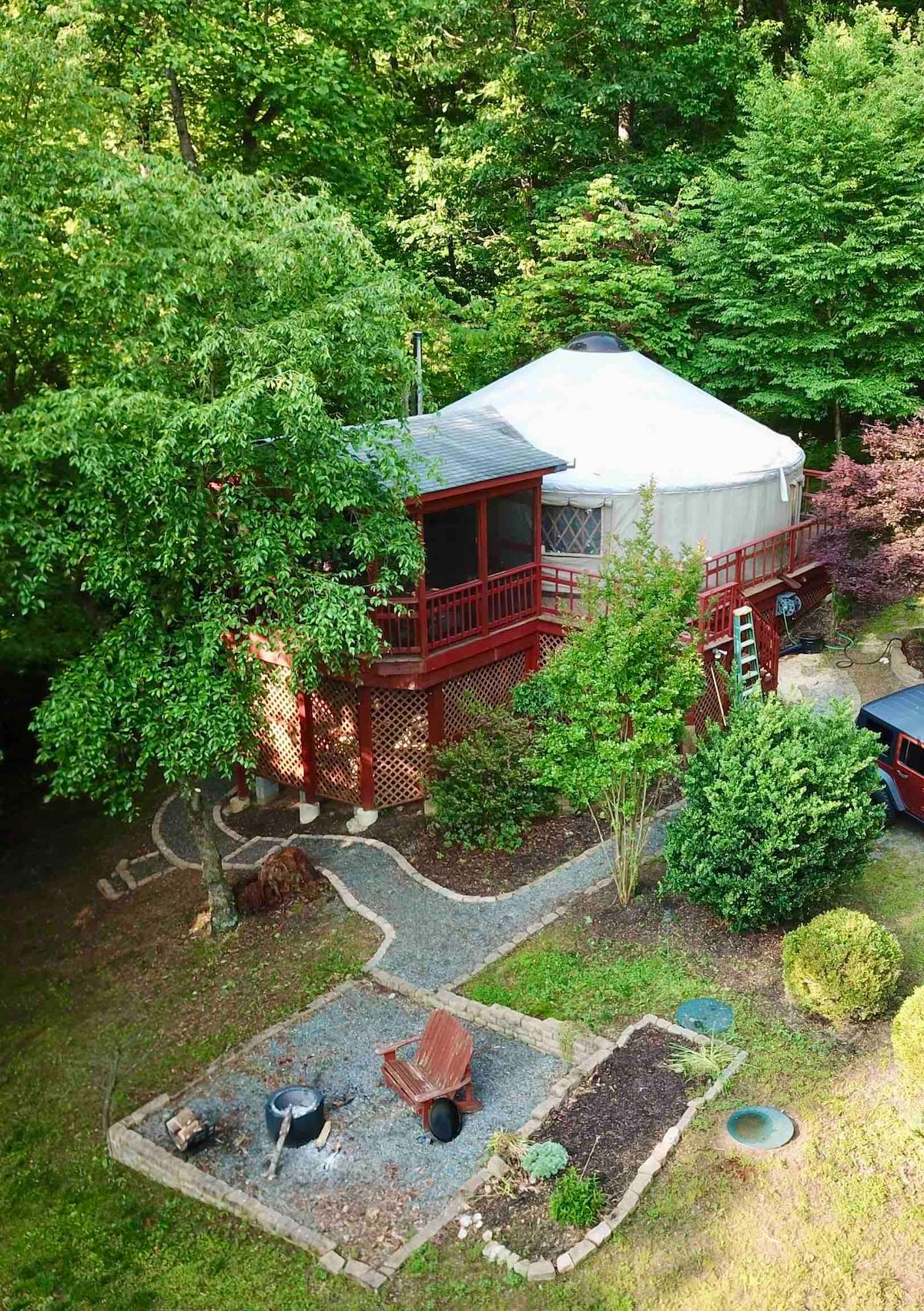 The spacious one bedroom yurt is located high on a forested hillside in the middle of 15+ acres. Come enjoy a natural and serene getaway with all the comforts of home- a full kitchen (ie, all utensils, setting for four), a bathroom with shower and laundry, a queen bedroom, and a queen foldout sofa in the living room by the wood burning stove. The windows roll up from the outside and have permanent screens inside. There is also a BBQ grill, a separate firepit, and WiFi via satellite.
