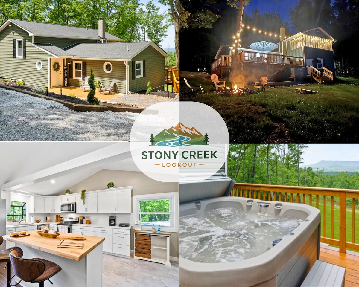 Stony Creek Lookout is a one-of-a-kind luxury retreat perched in the serene seclusion of the mountains.Brand new complete renovation, modern amenities, hot tub, sizable elevated deck, video/board games, theatre room, kayaks and high quality furnishings !This extraordinary stay adjoins the Shenandoah NatlPark with the best views in the Shenandoah Valley, hike out your back door. Pet friendly, 5 min from Massanutten 4 season resort, Shenandoah River & much more. Great Wifi & cell service! 5 TVs