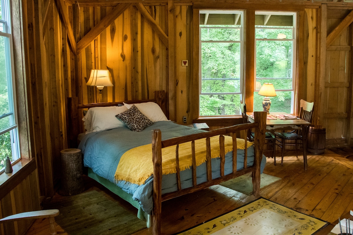 Our rustic barn loft, crafted from native wood, sits on a 20-acre working horse and health farm in Virginia’s Rockfish Valley near the Blue Ridge Mountains. This peaceful farm stay features a cedar queen bed and single bed—perfect for a relaxing getaway, writer’s retreat, or nature escape. Experience true simplicity with a handcrafted all-wood outhouse, outdoor shower, and mountain tranquility just 4 miles from Skyline Drive.