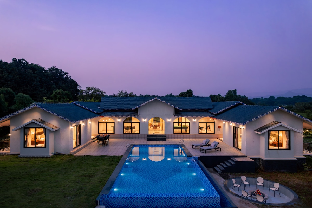 This hidden gem is nestled amidst the uninterrupted views of breathtaking Sahyadri mountainscapes of Igatpuri. Located in a serene, untouched location, this four BHK villa boasts modern-chic interiors, plush furnishings, a private infinity pool, a rooftop glass house and a cozy lawn. Whether you're in search of private villas In Igatpuri, family villa in Igatpuri with private pool or the best luxury villas in Igatpuri, this place has it all!