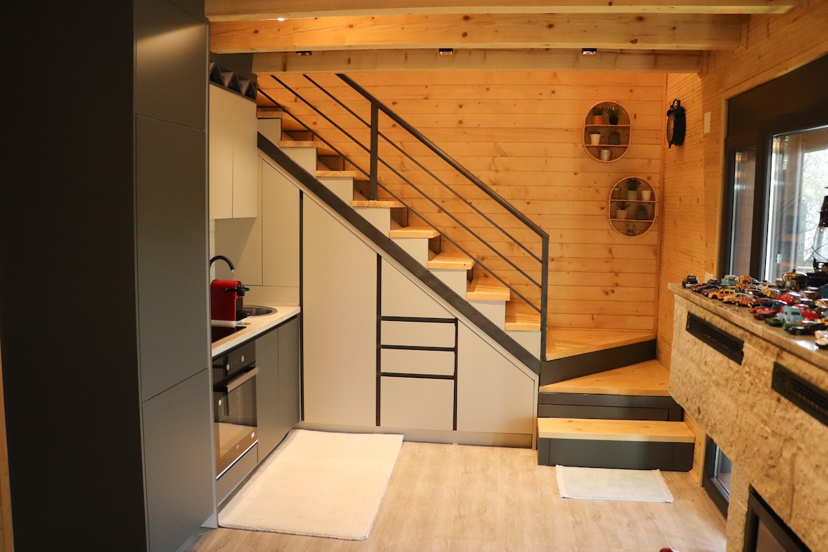 This thoughtfully designed cabin is ideal for a family vacation for up to 6 people. It has a large terrace over the Bojana river which is a perfect resting place, lounge, dining space or whatever you can imagine. Inside the cabin you will find a spacious living room with kitchen, above which are two bedrooms in the loft.