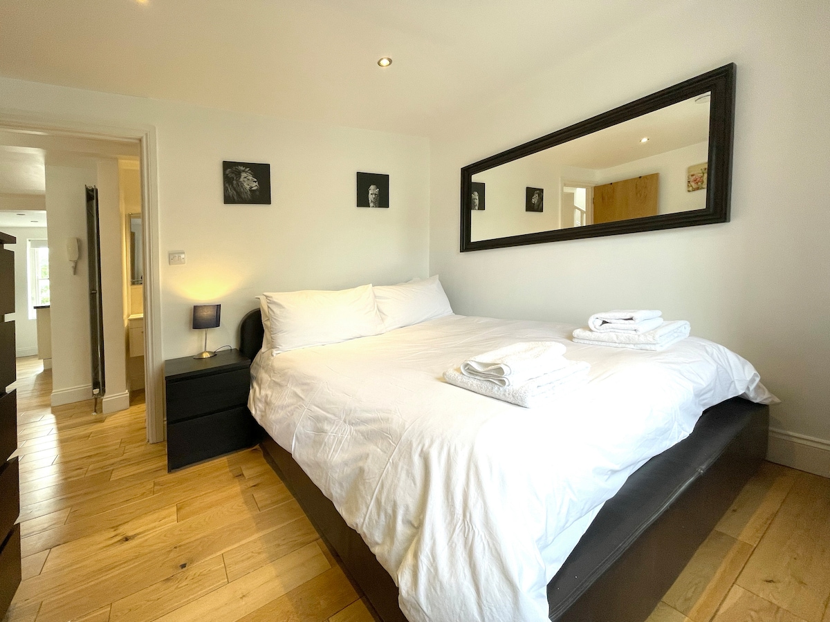One double bedroom with King size bed; a living room. A fully equipped modern kitchen with hob, microwave/grill, fridge/freezer, dishwasher and Nespresso coffee machine; a modern bathroom with shower. The living room has TV and dining table/chairs. Free WiFi All bedding and towels are provided. Quality Egyptian cotton linen. Complimentary toiletries. Complimentary Nespresso coffee pods. Hairdryer. Washing machine Iron and ironing board. Clothes drying rack. Check in 4pm / out 10am