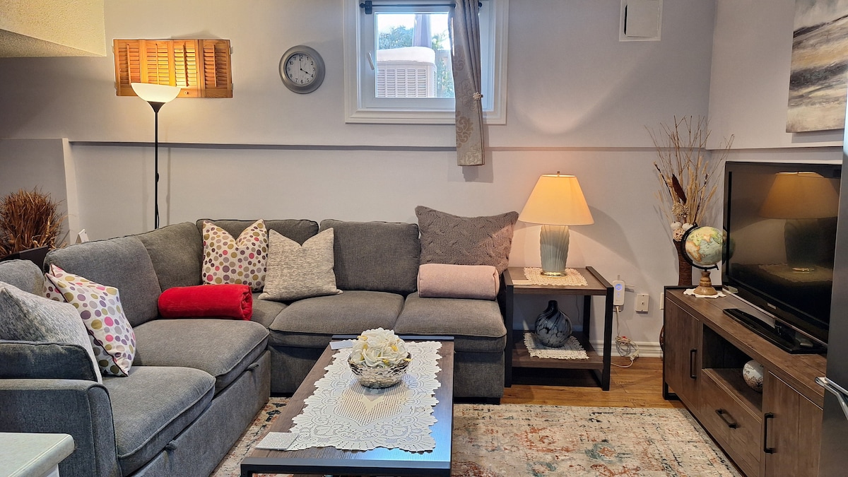 Enjoy a stylish and peaceful stay at this centrally located one-bedroom lower-level unit, perfect for both leisure and business travelers. With your private entrance, parking, and all the essentials, it’s your ideal home away from home. Features include a full kitchen, bathroom, internet, smart TV, one Queen and one sofa bed, and a functional workspace. Steps from FreshCo, Walmart, restaurants, and services. Minutes to Vaughan Mills, Canada’s Wonderland, Cortellucci Hospital and transit.