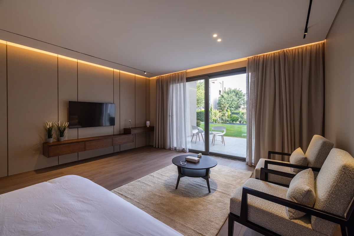 Escape the hustle and bustle of the city and unwind in this tranquil 90-square-meter open-layout studio. Enjoy spacious living, a comfortable king-sized bed, and an unmatched fully equipped kitchen. Location: Just a 5-minute drive from AUC, The Spot Mall, and Point 90 Mall, 25 Minutes from Cairo Airport Message me for more details or book your stay instantly. I can help you with planning your trip, recommending authentic Egyptian restaurants, or guiding you to the hidden gems of the city.