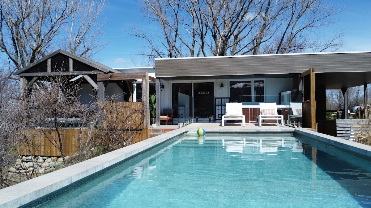 Escape to our serene, eco-friendly luxury retreat near Mansonville. This private 2-bedroom second-floor apartment offers a Zen-like atmosphere for up to 4 guests. Enjoy unique architecture, a spa-like bathroom, and access to a private, swimmable spring-fed pond. A perfect nature getaway with modern comforts, located on a quiet dead-end road.