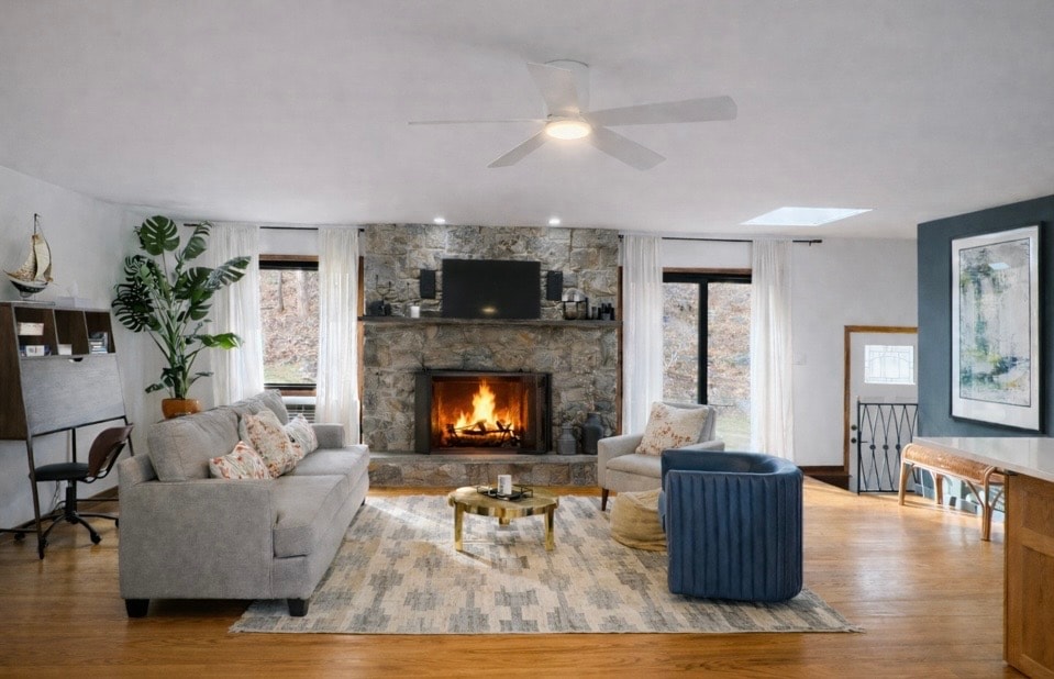 Welcome to @ranch_inthewoods No cleaning fee STR permit #34035 This newly built ranch-style home with thoughtfully designed wabi-sabi interiors sits in the woods of the Warwick Valley. It's located a short drive away from several lakes, hiking trails, breweries, and dining experiences. It features forest/creek views, designer furniture, modern appliances (dishwasher, washer/dryer, gas cooktop), smart 4k TV, gym & yoga studio, gas firepit, and ample deck with an outdoor kitchen & dining area.