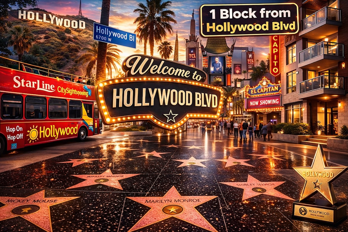 NOTE: This is 4 miles from the📍pin! I am located in HOLLYWOOD 🤩 The main cross streets are Hollywood Boulevard and Vine. Within walking distance to the Hollywood Walk of Fame, Chinese Theatre, and many other popular tourist destinations. Griffith Park, & Hollywood Bowl all minutes away! 5 min drive to Universal or 2 metro stops away! 🥳 Scooters to rent to explore the city and all foodie experiences literally just outside your door! 🤩💃