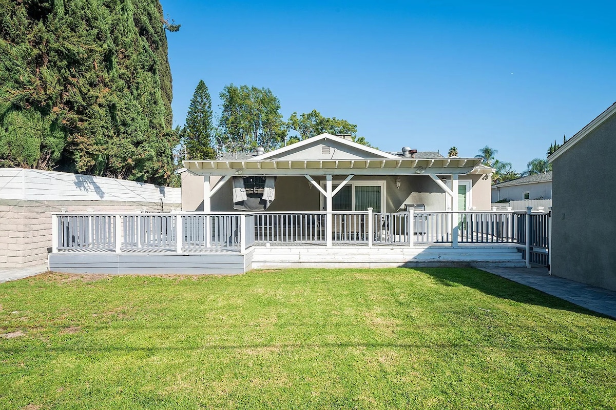 Escape to our family-friendly oasis, perfect for families with little ones or a romantic getaway for couples. Our spacious home features a big backyard, patio with a large TV, and plenty of parking in our long driveway. Inside, you'll find two living rooms, a modern kitchen with high-end appliances, washer and dryer, TV in each room, and both indoor and outdoor dining options. Enjoy barbecuing and outdoor showers, or simply relax on our porch with a bench. Book now for a memorable stay in LA!