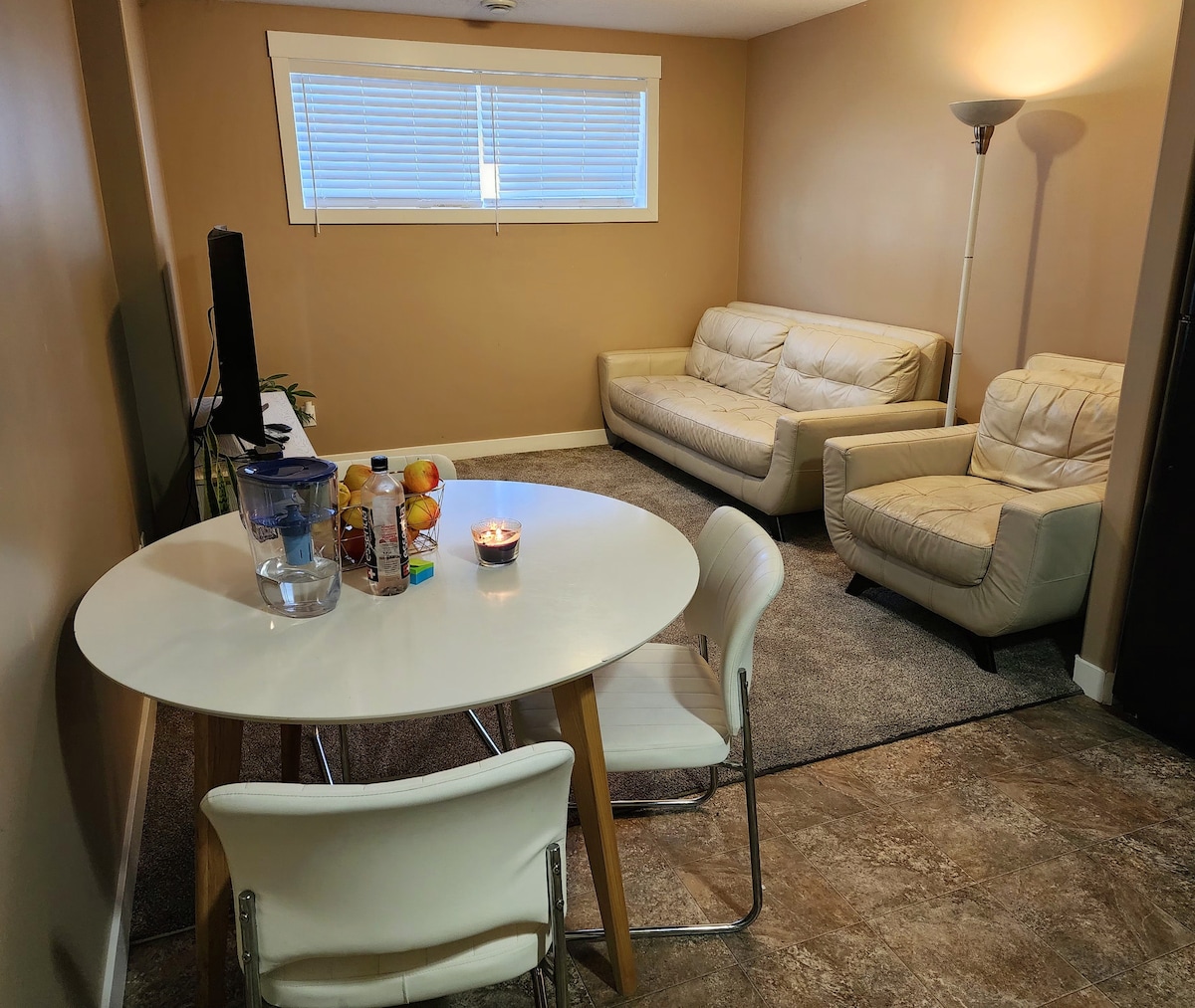 Welcome to my brand-new, cozy one-bedroom basement suite, situated in a quiet neighborhood in the west of Regina. This suite has a private entrance and 1 free parking spot. Easy access to the Regina Bypass, Ring Road, and Trans-Canada Highway. Only 4 minutes from RCMP, 6 minutes from Cargill, 8 minutes from Regina International Airport, and 9 minutes from Mosaic Stadium 10 minutes from downtown. Playground and green space across the street. Can't wait to host you!!!