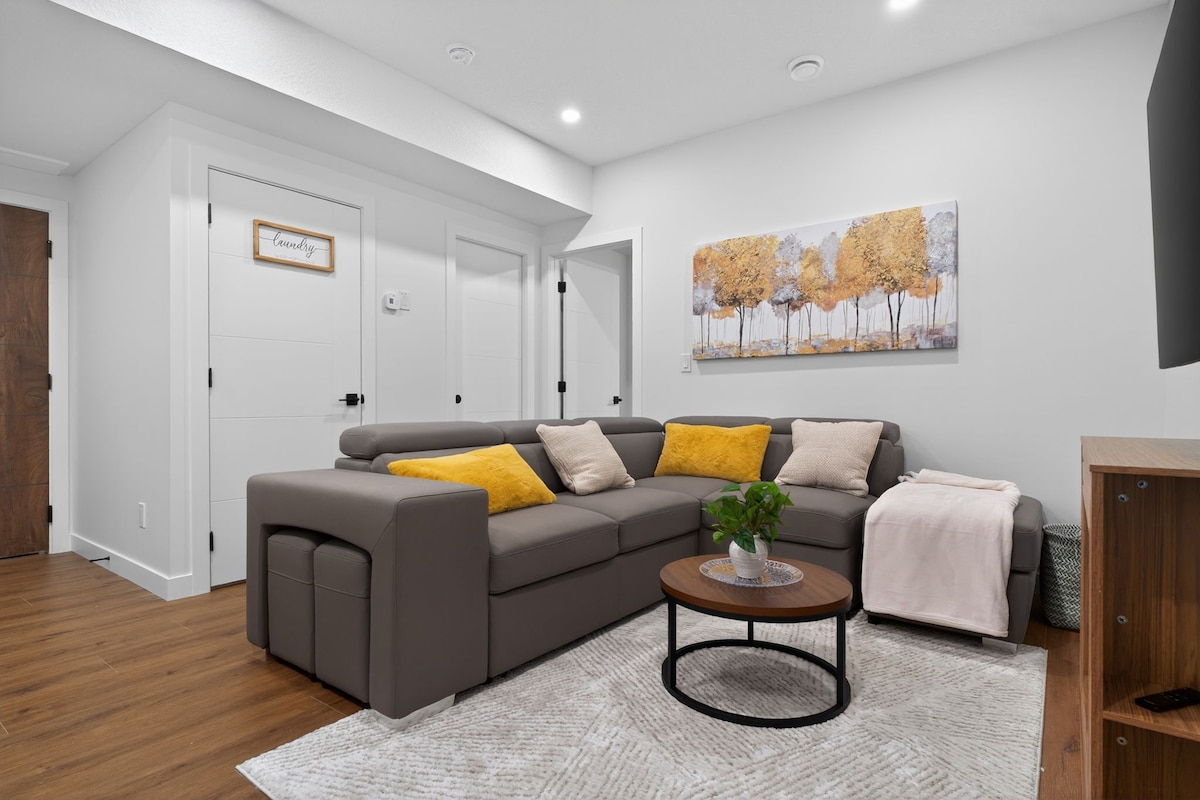 Brand New, clean and spacious. This lower level apartment is an excellent place for a short business trip or for a longer visit. It's excellent for a solo traveler, couple and families on vacation. It has a beautiful spacious bedroom with a queen bed. Bright bathroom for all your 🤳 selfies and in suite laundry. There's a queen foam mattress and an inflatable matress available for additional sleeping.