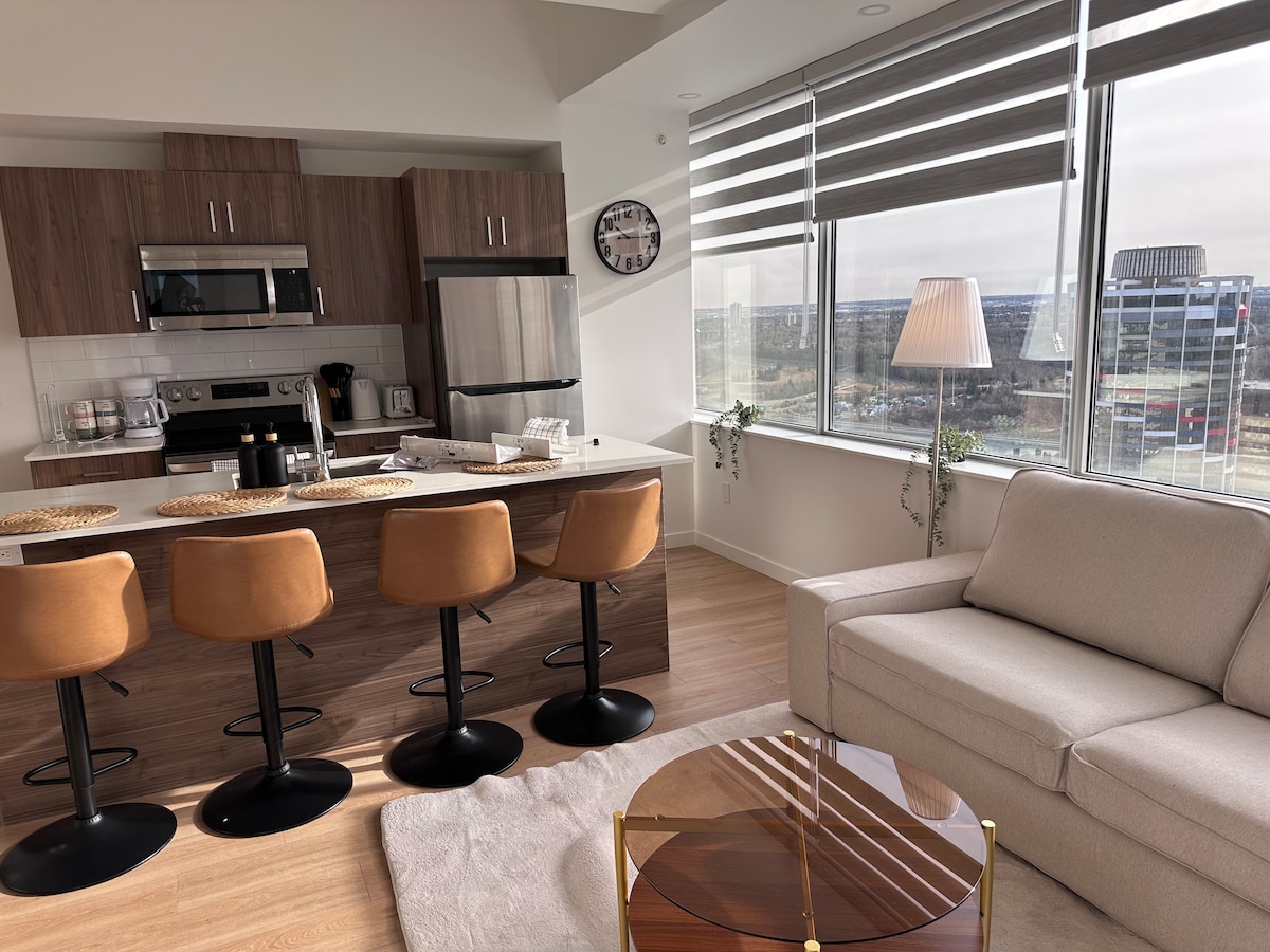 Check out your stylish and spacious AirBnB in downtown Edmonton. Welcome to a five star AirBnB equipped with everything that you need for a comfortable stay close to all that downtown Edmonton has to offer with expansive views of the Edmonton River Valley. * Please note, our pool is currently closed. *