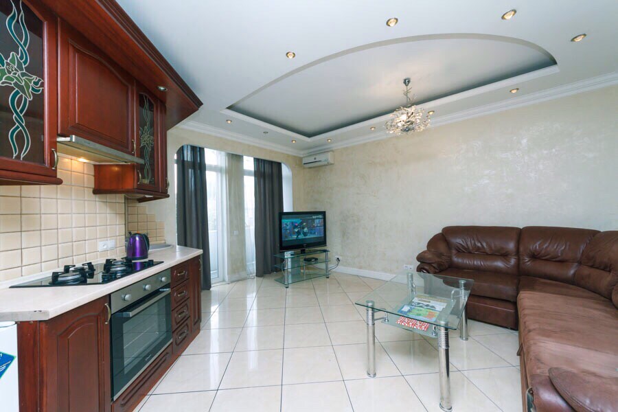 A cozy and modern apartment with a main room and a bedroom. The building is located on Proreznaya Street in the center of Kyiv, near Maidan and not far from Khreschatyk Street. It’s just a 3-minute walk to the 'Teatralna' metro station. The bedroom features a large double bed, and the second room has a sofa. The apartment also includes a fully equipped kitchen, bathroom, and toilet, along with a TV and internet access