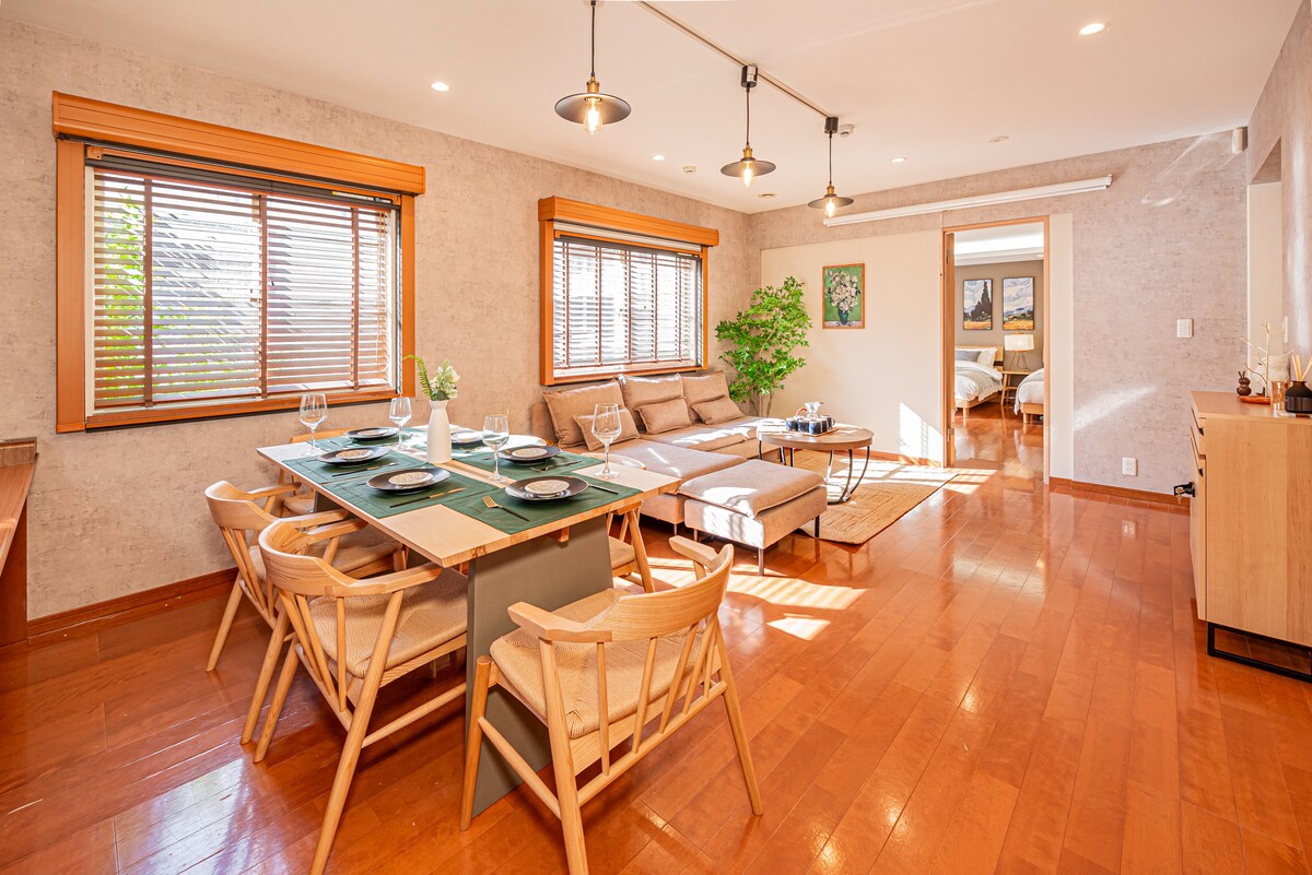 Experience a unique blend of Scandinavian and Japanese design in this renovated 86-year-old, two-story home in Sangenjaya. With 80㎡ (900 ft²) of bright space, a 3-meter ceiling, and a dramatic 7-meter ceiling above the kitchen, it’s perfect for families and small groups. Just 6 minutes to the station and 4 minutes to Shibuya, the house offers the perfect mix of calm and city convenience in one of Tokyo’s most beloved neighborhoods, Sangenjaya.
