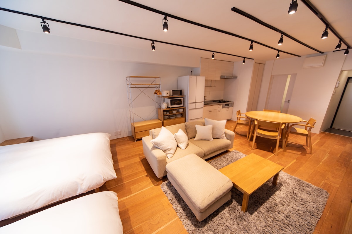 位于东京市中心,邻近六本木、涩谷、东京塔、浅草、银座等主要旅游景点,前往机场也非常便利,是您观光旅游的理想据点。 步行8分钟即可到达六本木新城(Roppongi Hills)。 可提供提前入住/延迟退房服务 根据情况可免费或收费提供。如有需要,请提前告知。 ★入住时间:16:00/退房时间:10:00 住宿信息 ※在发送咨询信息之前,请务必阅读本页面的所有内容。 公寓位于麻布十番站步行6分钟处,为1LDK复式结构,面积为55㎡,可容纳最多4位客人入住。 附近有超市、药妆店和众多餐厅,生活非常便利。 公寓配备客厅、厨房、浴室、卫生间,并提供带烘干功能的洗衣机,出门或就寝前使用都很方便。 一楼和二楼均设有宽敞的私人露台,阳光充足,是放松休息的好去处。秒。 房内配有客厅、厨房、浴室和厕所。 两个卧室分别配有一张床、一张沙发床和两个榻榻米垫子(传统和室),提供舒适的住宿体验。