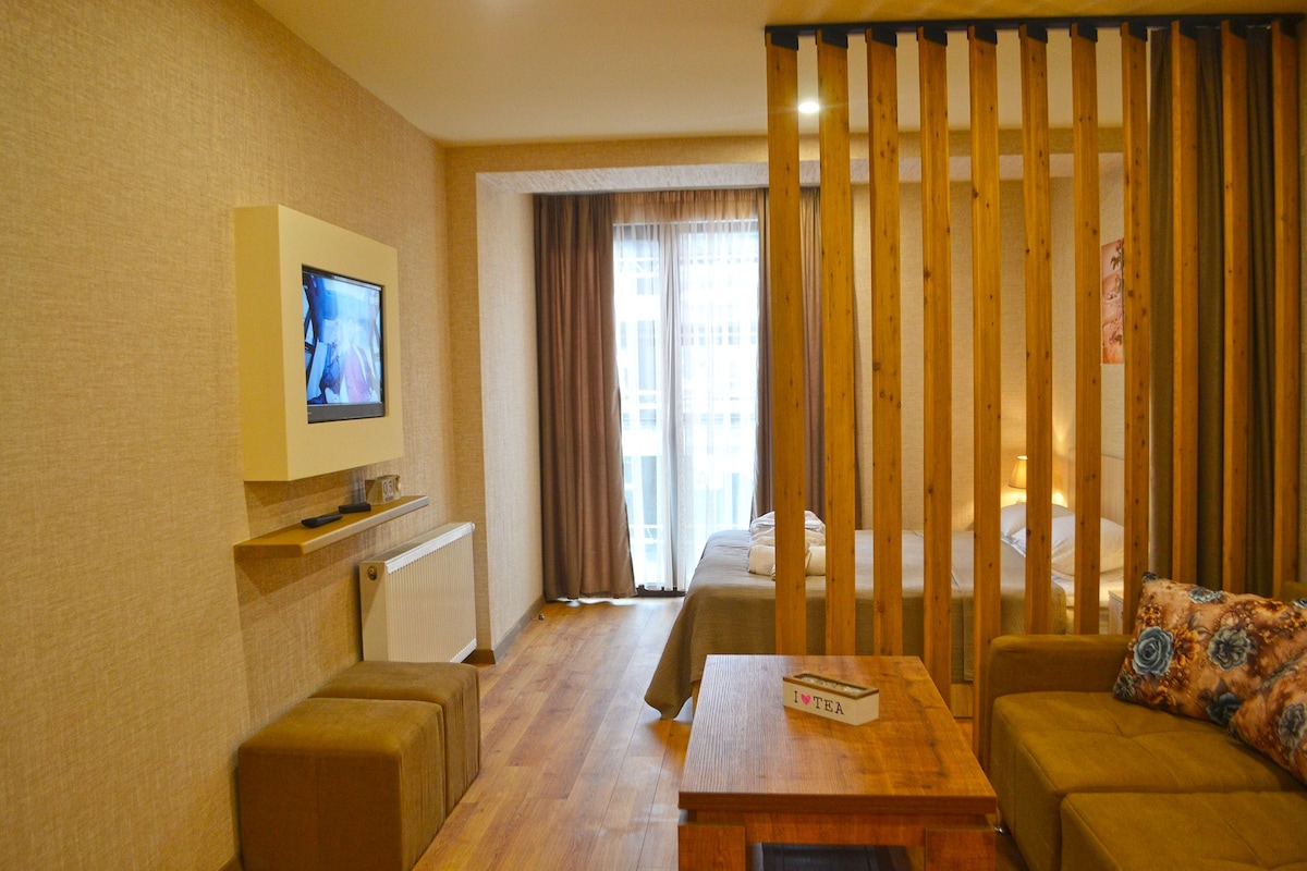 This beautiful Apartment is located in Heart of New Gudauri, walking distance from the main Ski lift, "Gondola"! A queen-sized bed with sleep-promoting mattress and comfy double-sized sofa , with a fully stocked kitchenette for home cooking, board games and amazing cozy atmosphere.