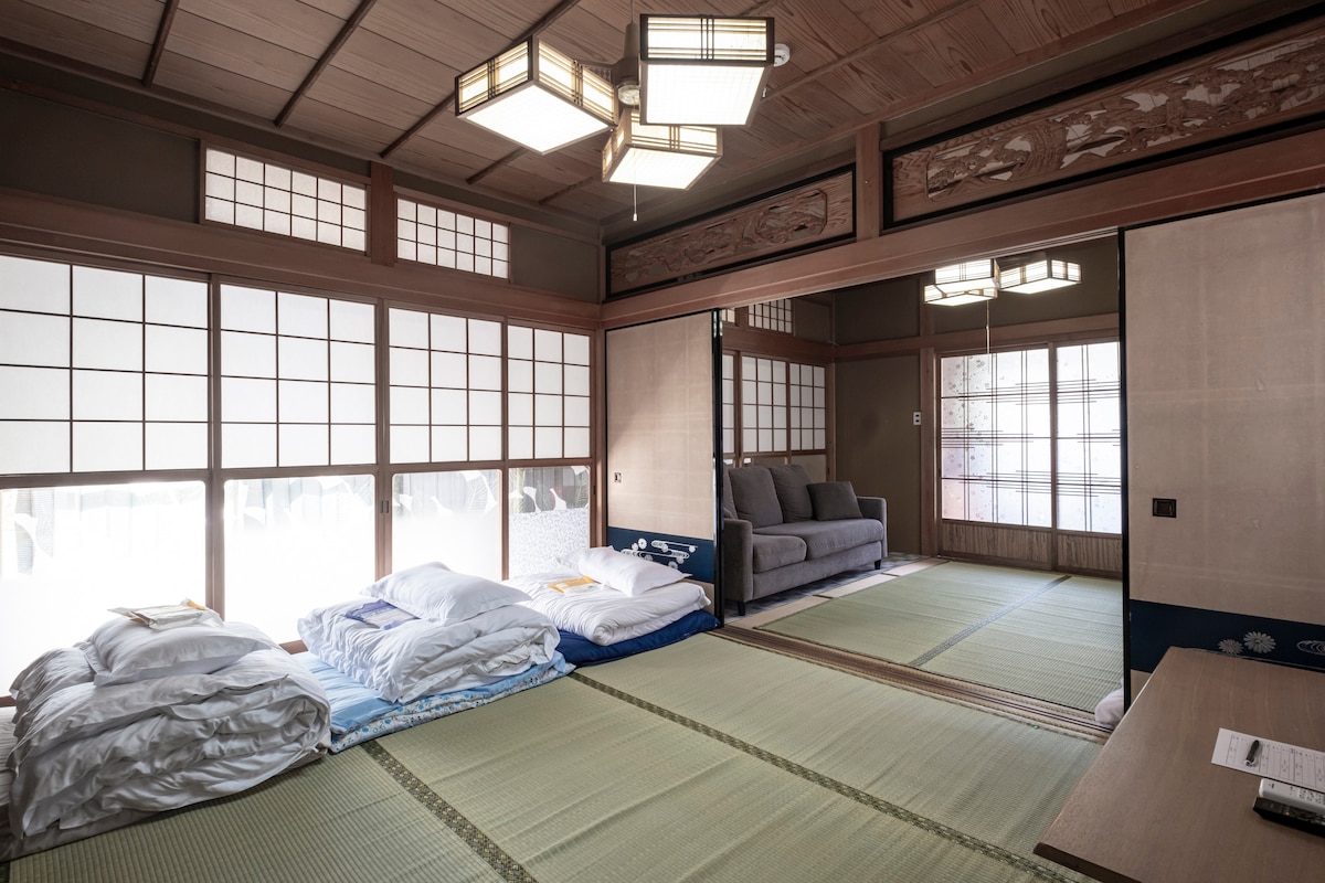 Experience authentic Japan at SHUKU-NO-YOYO. Perfectly located in the historic district, steps from the city's best gems. 📍 Top Location: 10-min walk to La Collina: Iconic architecture & sweets. 7-min walk to Hachiman-bori Canal: Famous Samurai movie site. 5-min walk to Local Market: Perfect for premium Omi Beef. ✨ Highlights: 4BR Home: Traditional layout with backyard & balcony. Modern Perks: Full kitchen (dishwasher) & 50" Smart TV. Convenience: 4-min walk to 24h Lawson & free parking